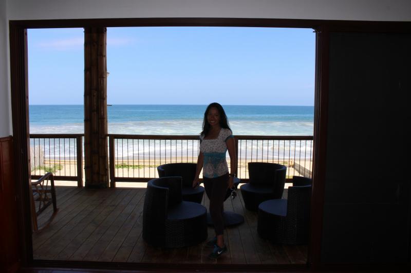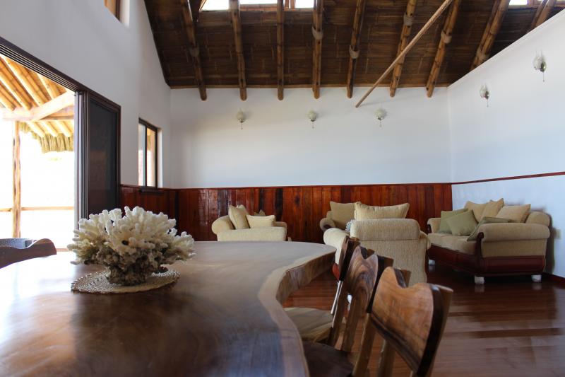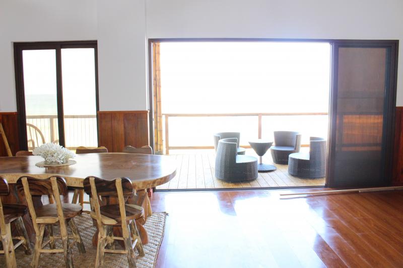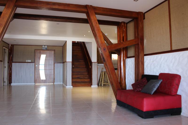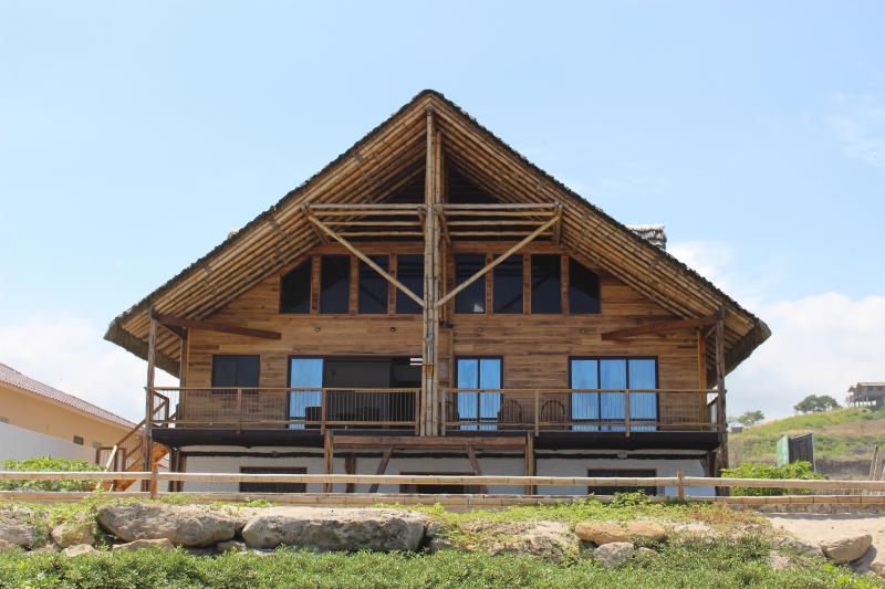 Second floor features very large balconys front and back. Frosted glass double door entry to upstairs master bedroom suite. Suite runs front to back of house with amazing view of the ocean. Two hallways leading to master bathroom area. Double vessel sinks, vanity, and a shower area that you have to see to believe. Lights will go on the minute you walk into the bathroom area. Upstairs kitchen features granite counter tops(one with stools),cook top, oven, microwave oven, 2 sinks,large refrigerator and walk in pantry. Kitchen opens to dining room with hand carved dining room table and chairs. Tiki style hand carved beam over head. Open living room with hand carved coffee table surrounded by over stuffed chairs and sofas. Both open to balcony and have view of the ocean and open to bamboo rafters. The media room is down the hall to watch your favorite shows. Further down the hall is a half bathroom and a second bedroom with full bath. Across the hall is a laundry room and a all purpose room. Upstairs and downstairs is equipped with emergency lighting.
