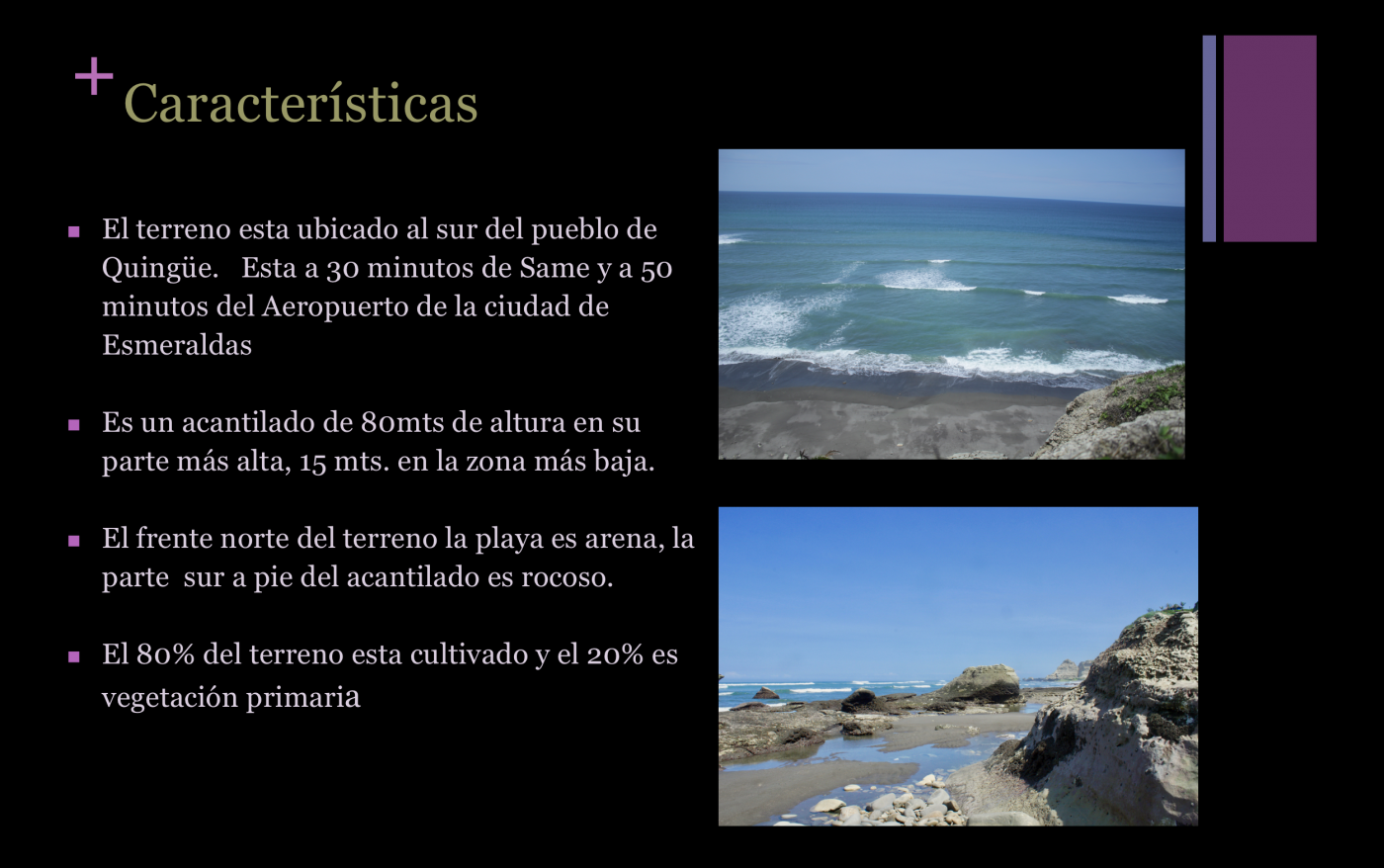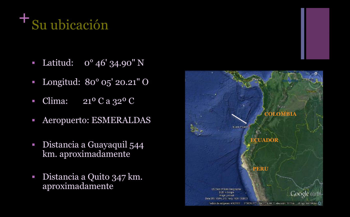 Airport: Esmeraldas (Tachina) is 90km approx.
