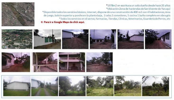 For sale by family Emergency Property of 1978m2 and a construction of 300m2, access to all basic services, irrigation water, flat land, fruit trees. 117 thousand negotiable are requested, Located in San Vicente de Yaruqui 10 minutes from Quito`s international airport. Sole owner