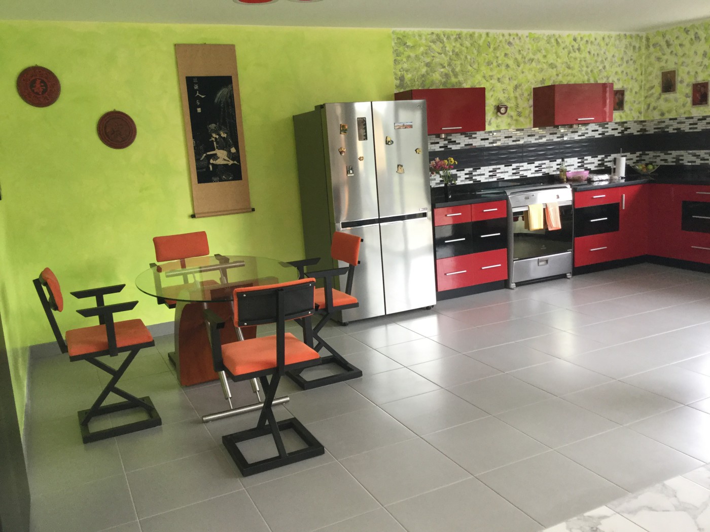 Large fully equipped kitchen ( double door fridge/freezer, electric oven with induction top) washer, dryer , master bedroom with en-suite bath