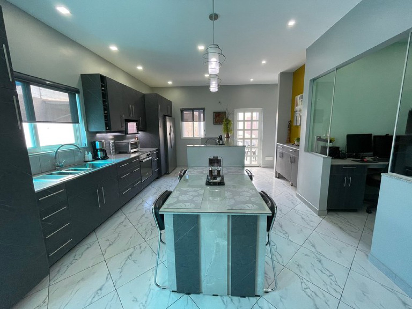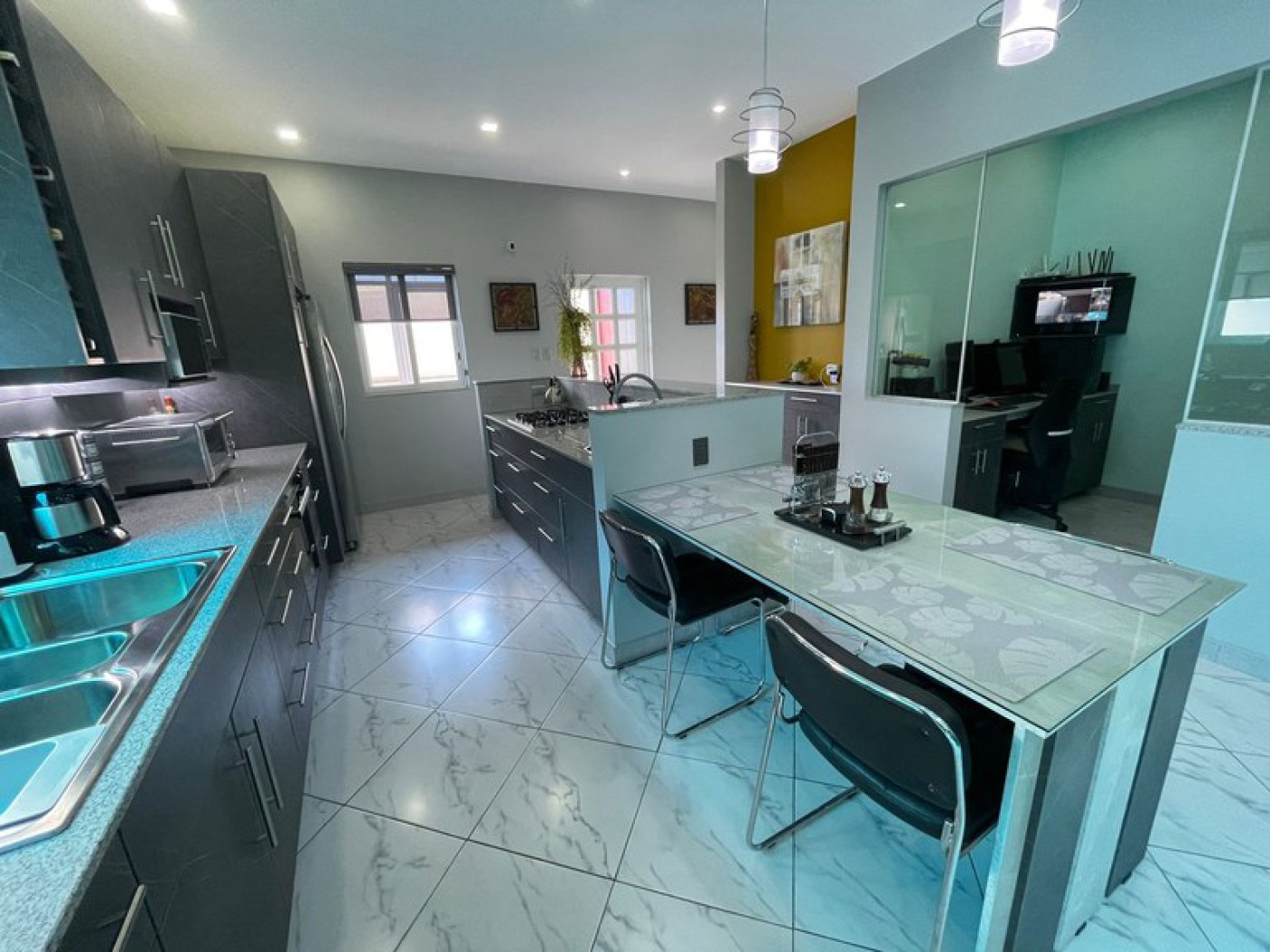 done. A built-in dining table and perfect lighting complete the area. A hidden reverse
