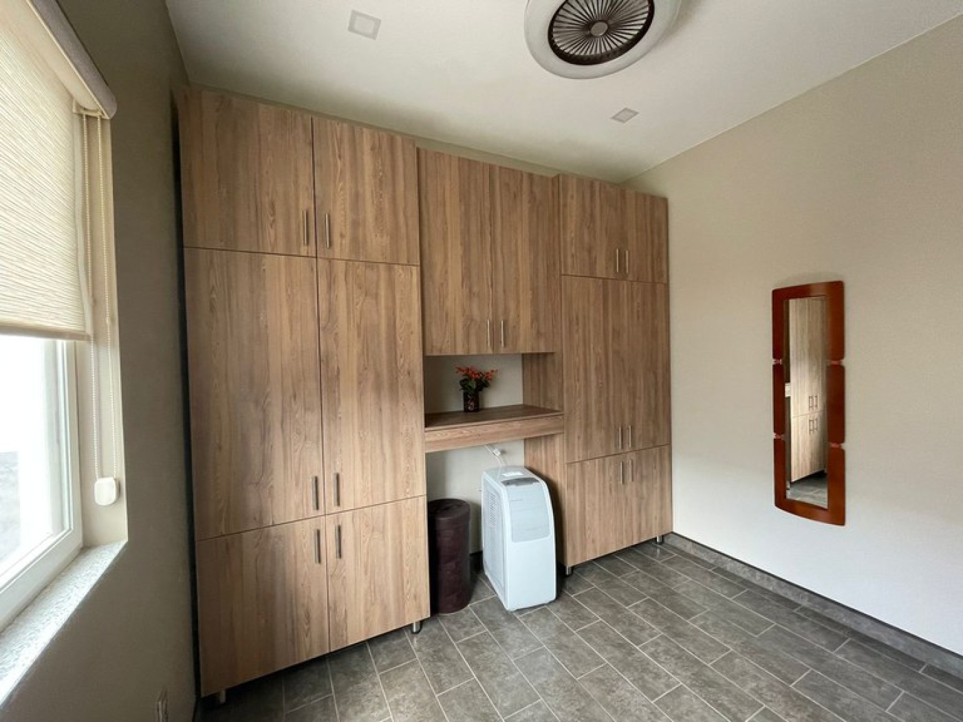 the wall for further storage. The house also has a glassed-in office area showing more
