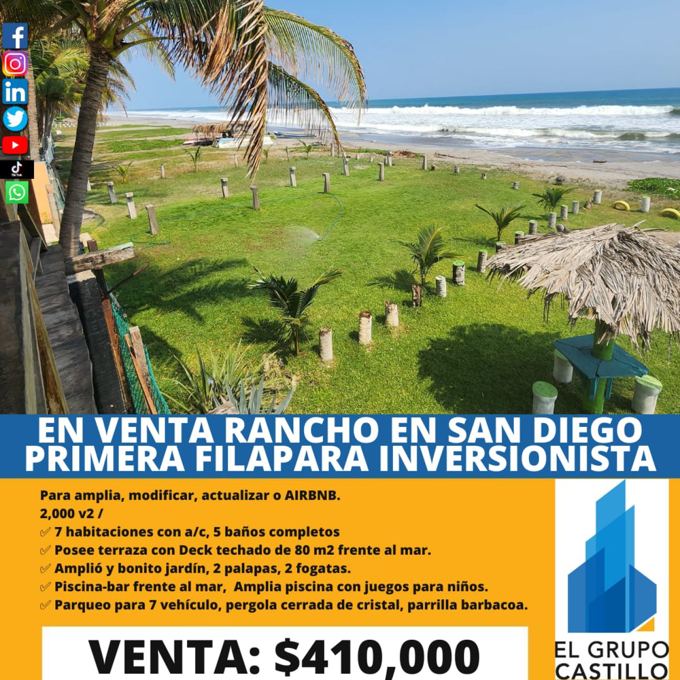 ✅ 7 habitaciones con a/c. ✅ 5 baños completos. ✅ Posee terraza con Deck techado de 80 m2 frente al mar. ✅ Amplió y bonito jardín con 2 palapas, 2 fogatas, 2 fogatas. ✅ Piscina-bar frente al mar. ✅ Amplia piscina con juegos para niños. ✅ Parqueo para 7 vehículos ✅ Pergola cerrada de cristal, parrilla barbacoa. ✅ Jardín frente a playa con 2 lapalapa y 2 fogatas.