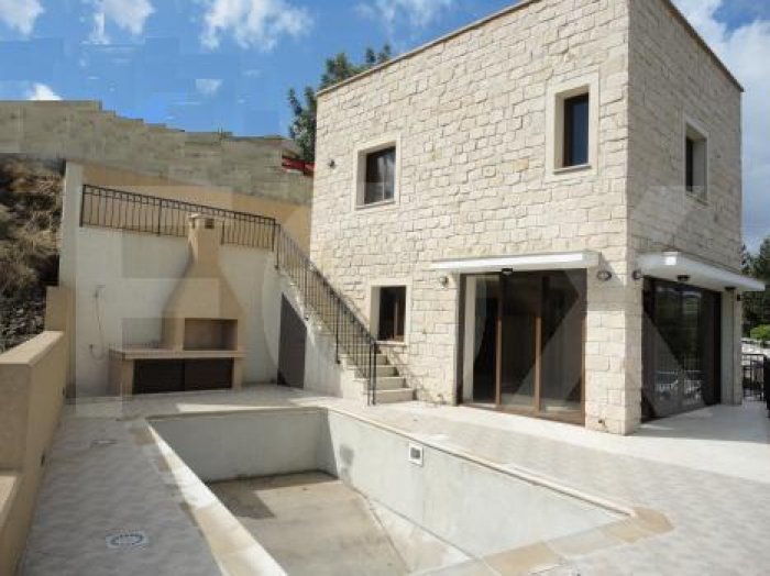 A beautiful new stone built detached house of 3 bedrooms in the quiet village of Asgada and within easy access to the highway. The house has panoramic mountain views. The house consists of ground floor the living area separated spacious kitchen with large patio glass doors open up onto the outside s/pool area with a large veranda. One guest . and wardrobe/cloakroom and a step level which leads down to the sitting/TV area with fire place. The upper level has 3 spacious bedrooms one master ensuite large terrace with panoramic views. There is a big garden barbeque place water pressure system roof garden and a parking area for 23 cars.