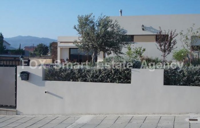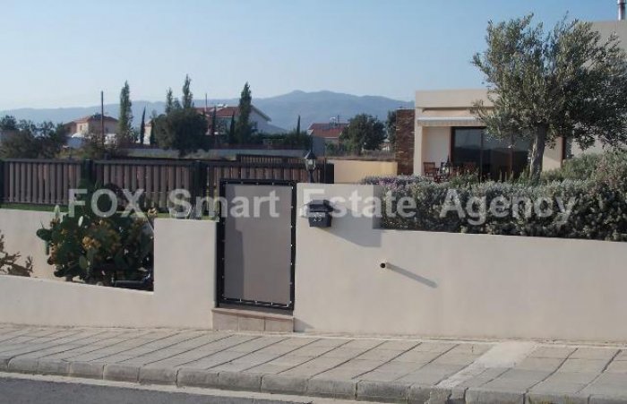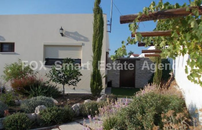 This is a lovely modern custom built bungalow offering a covered area of 185m on a plot size of 1006m. The property was built in 2010. Spacious and comfortable sitting/dining/tv areas overlooking the gardens fortable fully equipped kitchen part separate with low wall division guest wc and steps lead up to the bedrooms master en suite main bathroom two further bedrooms with fitted wardrobes. Double glazed windows fly screens external shutters landscaped gardens covered pergolas and awnings bore hole outside built in modern sitting area automatic irrigation system. A/c units provision for storage heaters. The building density has increased and a further 100m can be used if extension of the property is required.