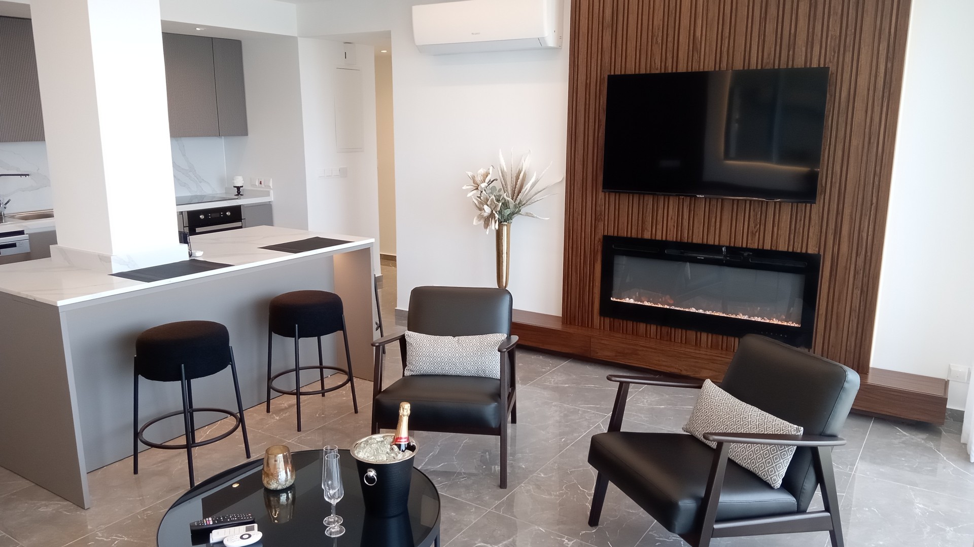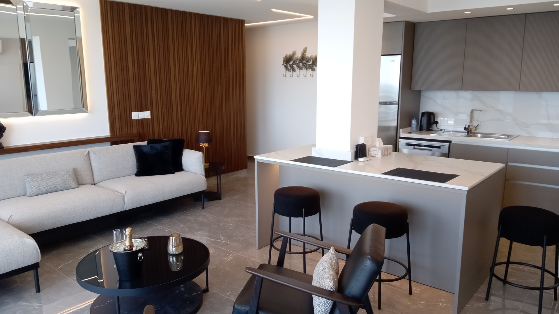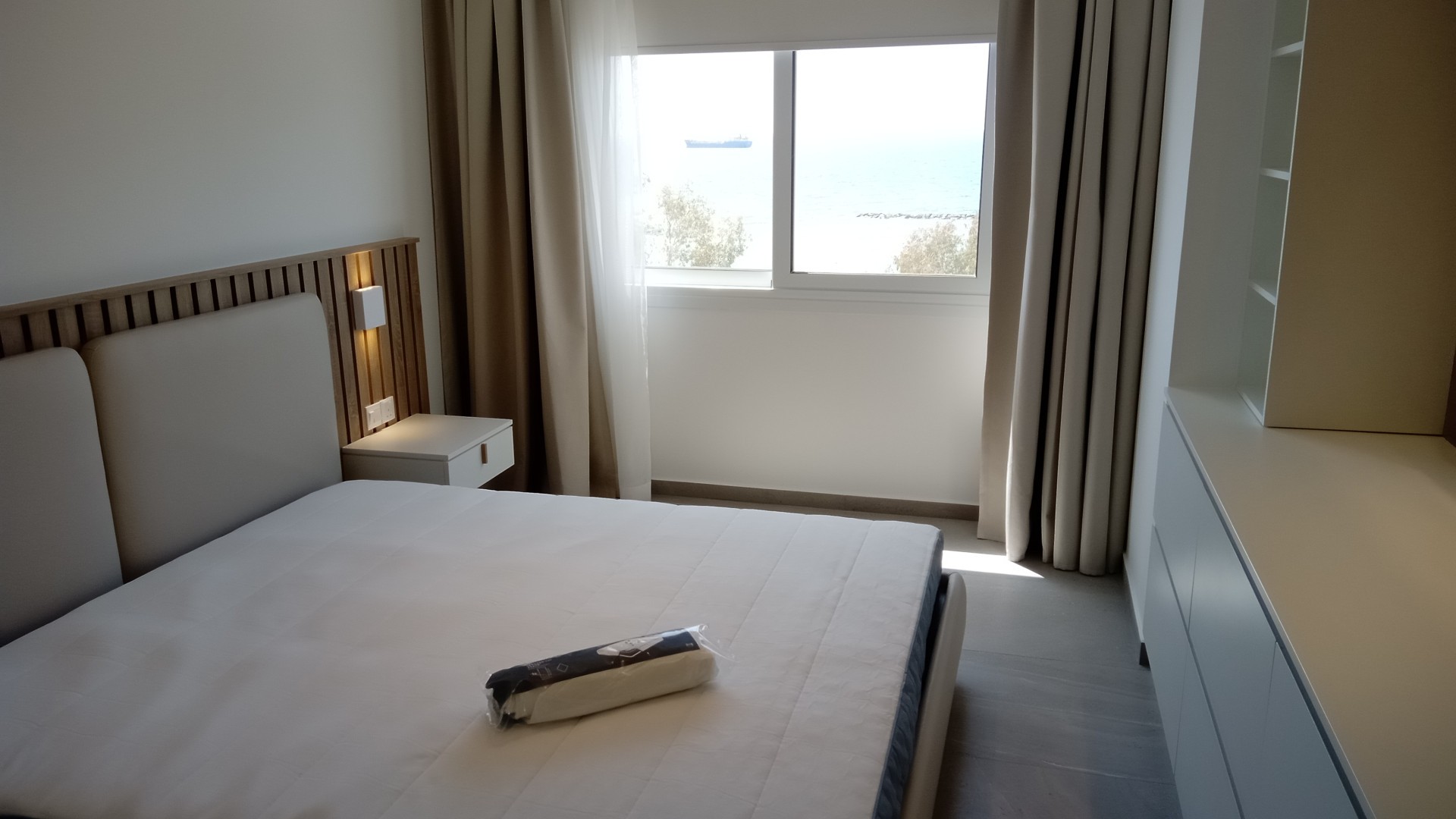 A Luxurious Fully Furnished Two Bedroom FRONTLINE Apartment Neapolis .A fabulous totally renovated property with unobstructed sea views directly opposite the beach close to Debenhams and just a ten minute walk to the historical centre and Limassol Marina.Two spacious master bedrooms both with large en suites and TV.s smart open plan living area with fully loaded kitchen with dishwasher wm dryer mw Tv guest WC HIGH SPEC throughout no expense spared for this 110sqm property bespoke fireplace feature covered veranda and parking.