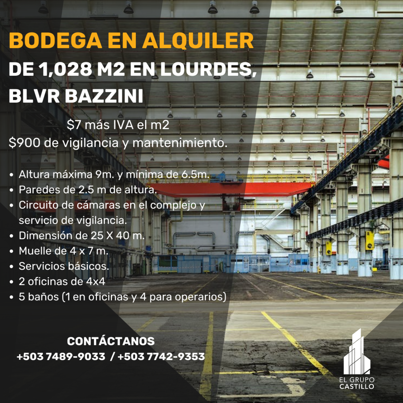 EN ALQUILER BODEGA DE 1,028 m2 EN LOURDES, BLVR BAZZINI