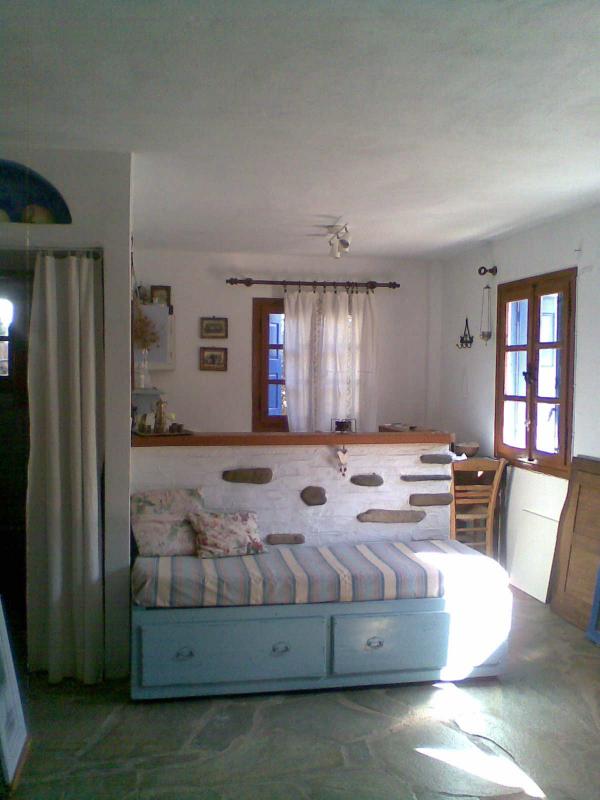 Beach front summer house,perfect choice for unwinding the warm Aegean sun,spectacular view,mature garden planted with vegetables,olive trees and flowers,peace and quiet,traditional Greek style,open living-kitchen area,two bedrooms,sleeps 6,veranda dining room,situated 5 km from beautiful traditional villages of Triandaros and Dio-Choria,with very nice restaurants open all day and 8 km from Tinos Town and the Port