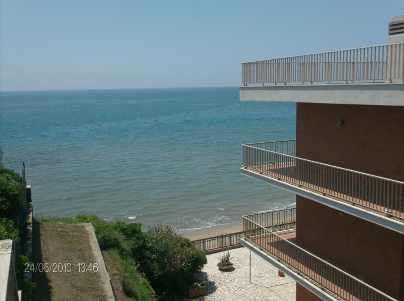Just on the seaside with private access to the beach, panoramic view of Nero caves, large balcony, large size: lounge, 3 bedrooms overlooking the sea, 1 single bedroom, 2 bathrooms newly refurbished inclusive of two showers and a bath, kitchen, laundry, parking, close to bus and train stations 45 km from Rome