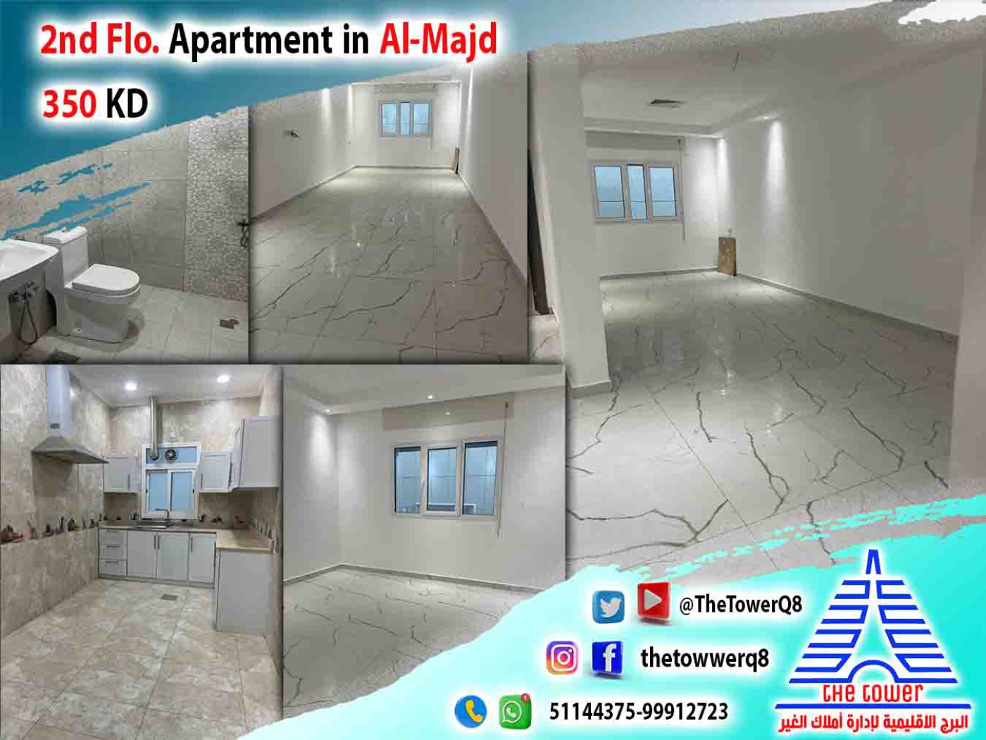 For rent an apartment in West Abdullah Al-Mubarak (Al-Majd) 2nd Floor - 3 bedrooms (1master) hall with guest bathroom - kitchen - car parking Rent: 350 K.D Kindly call & WhatsApp / --(Phone number)-- �` --(Phone number)-- thetowwerq8?igshid=MzNlNGNkZWQ4Mg==