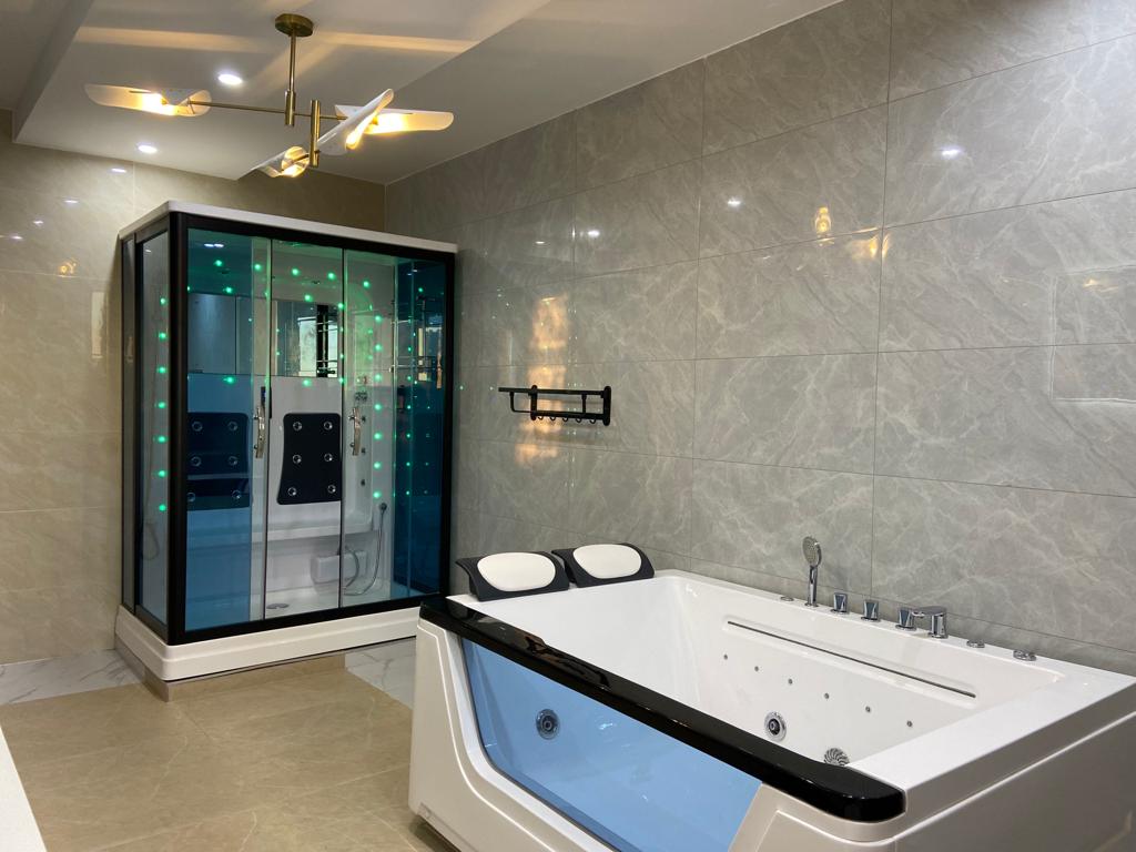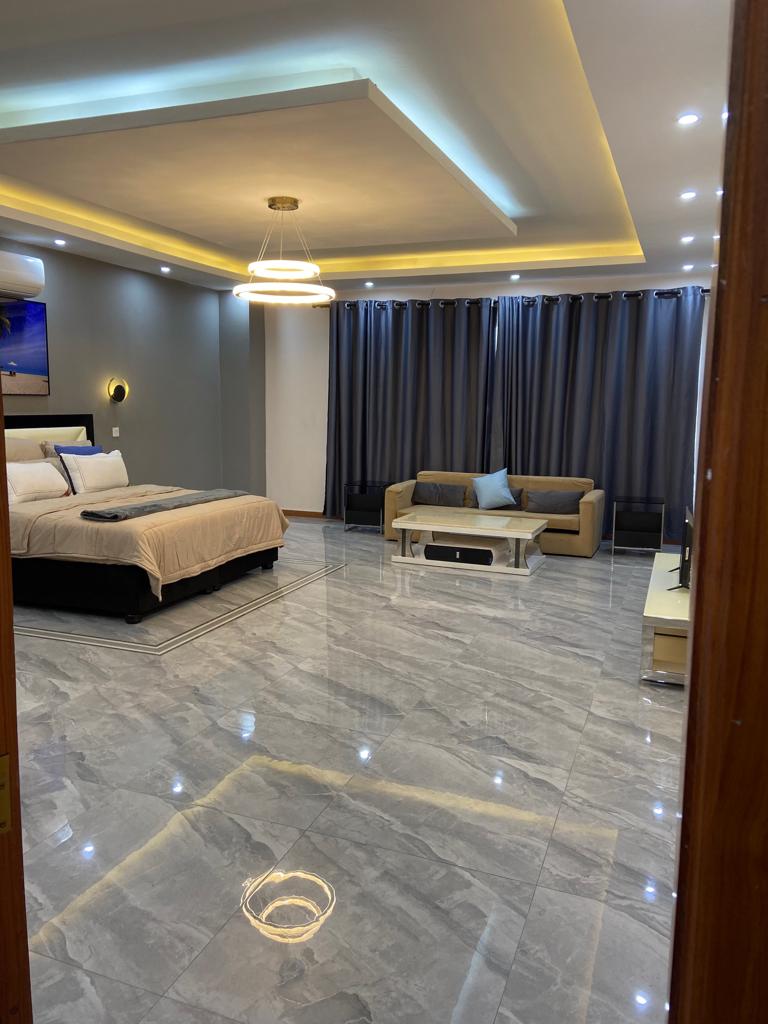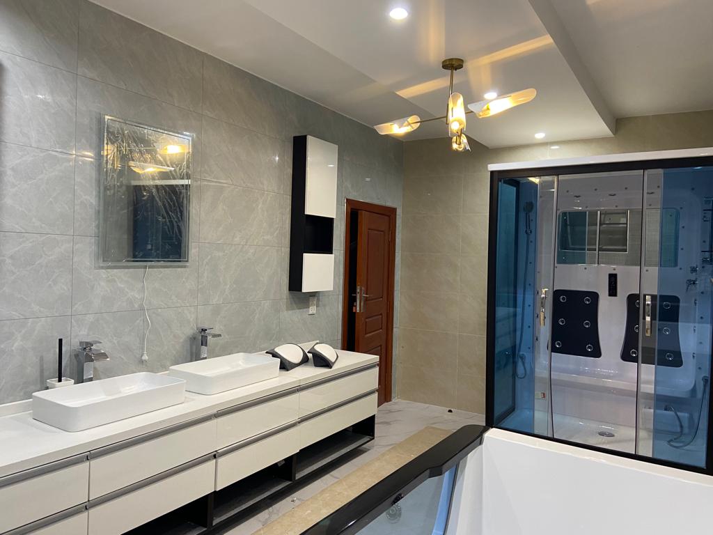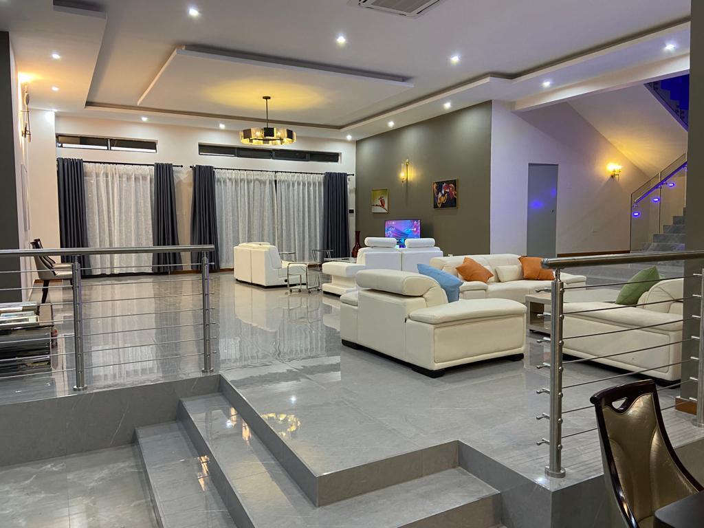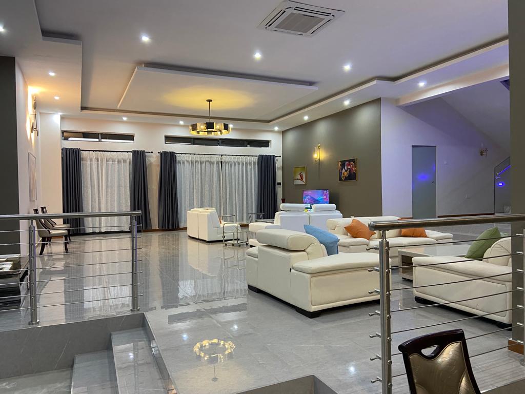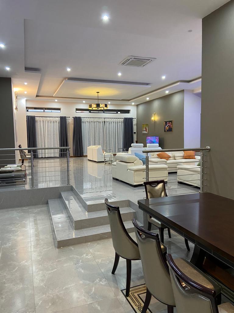 The house is 5 self contained bedrooms. Three bathrooms with steam shower cabins and 4 bathrooms with jacuzzis. A spacious living with an open a spacious kitchen, scullery and a pantry, spacious office, a laundry, a prayer room, two storerooms, a cooking gase room, two large balconies, with braiing provision. A small swimming pool, a three car garage with its store room. A maid quarter, a guard room, garden/ guard shower and toilet. Borehole and there will a 10Kwh solar power. The house is full furnished (basic). It is going at $ 5200 per month.