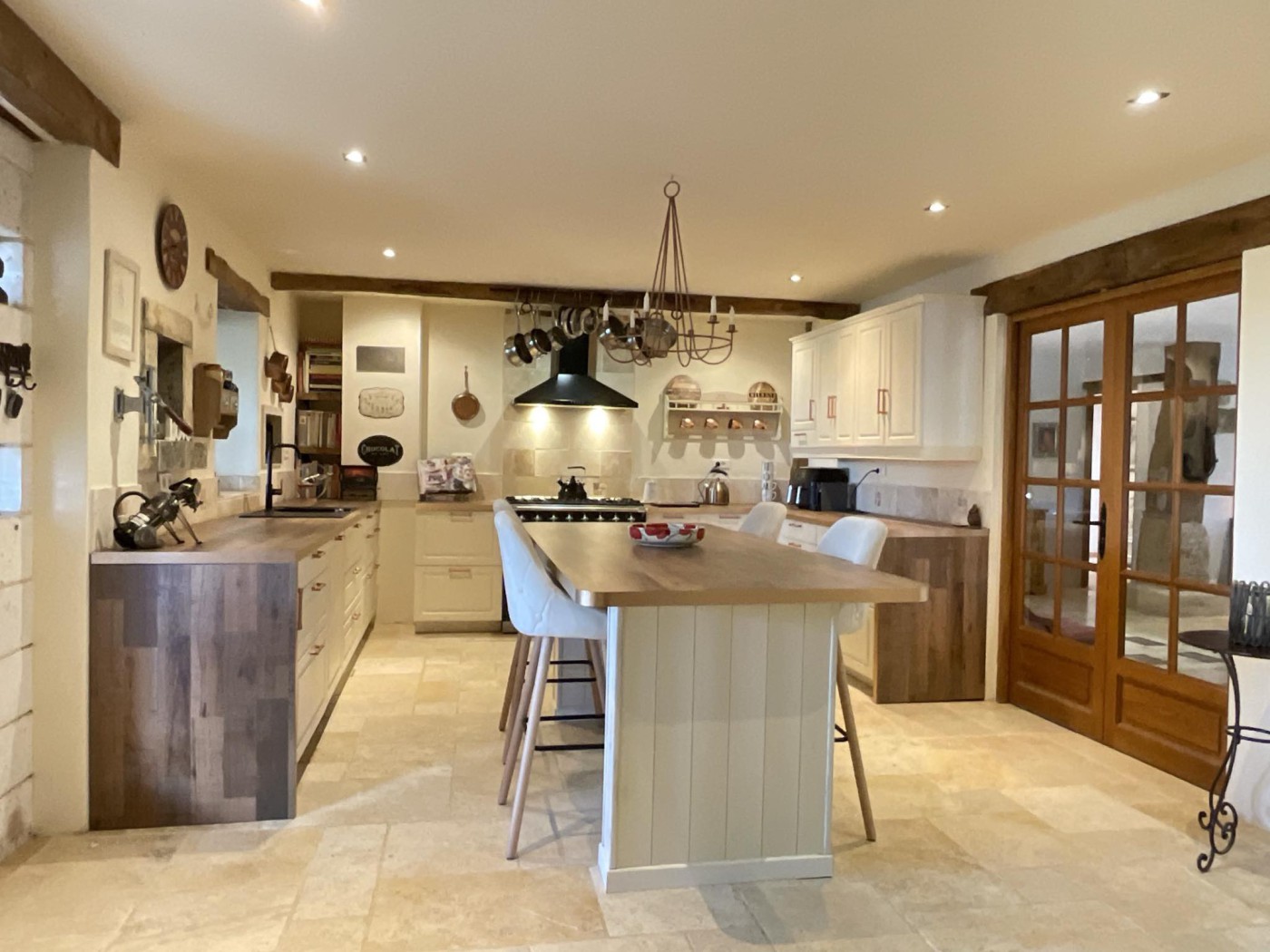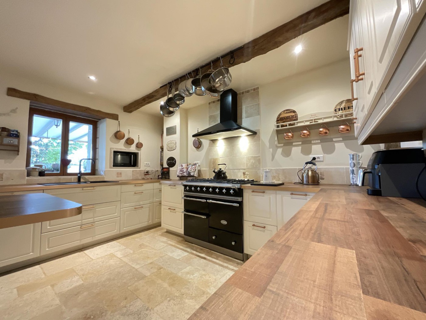 - Newly fitted kitchen (2022) with quality units, a large central dining island, natural stone flooring, and a Jotul log burning fire