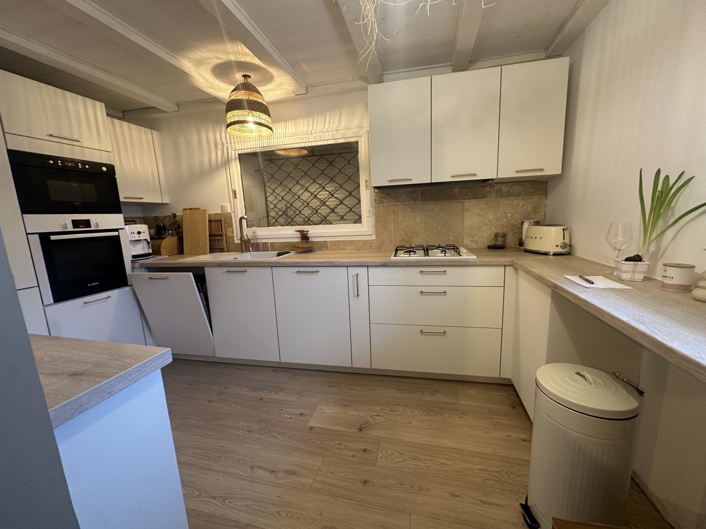 Property details: - Living space: 120 m² (Loi Carrez) - Land: 500 m² with apple, peach, lemon, fig, and cherry trees - 4 bedrooms and 2 bathrooms - Bright 35 m² living room with wood-burning stove - Open-plan kitchen with new gas appliances - Ground-floor suite with ensuite bathroom and separate toilet - 3 upstairs bedrooms with shared bathroom - Laundry room with electric water heater - Convertible attic with natural light - New double-glazed windows upstairs