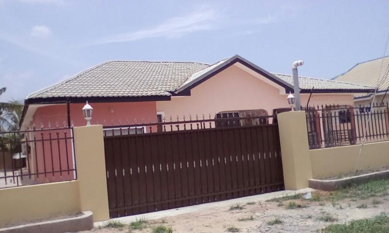 This is a newly built four bedroom house en suite located at tema golf city estate. it comes with built-in-wardrobes, laundry room, visitors washroom, living area, dining area, state of the art gallery kitchen, floor area made of porch lane tiles, roller shutter garage, paved compound with beautiful landscape, roofing made of aluminum zinc, ceiling made polish pallet wood members, panel doors with security locks, water reservoir walled and gated.