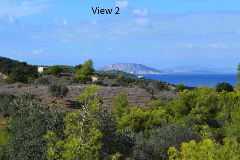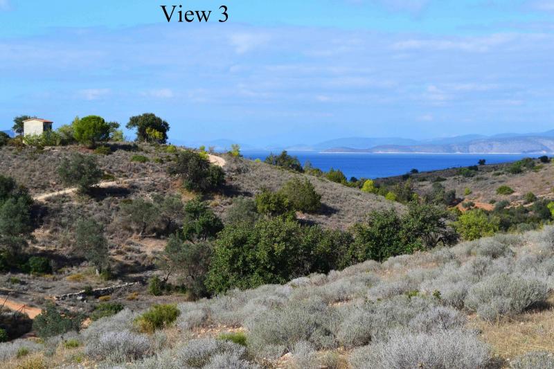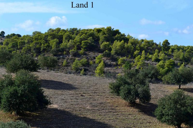 Serene sea and hill views, and a plot, surrounded from olive and pine trees.