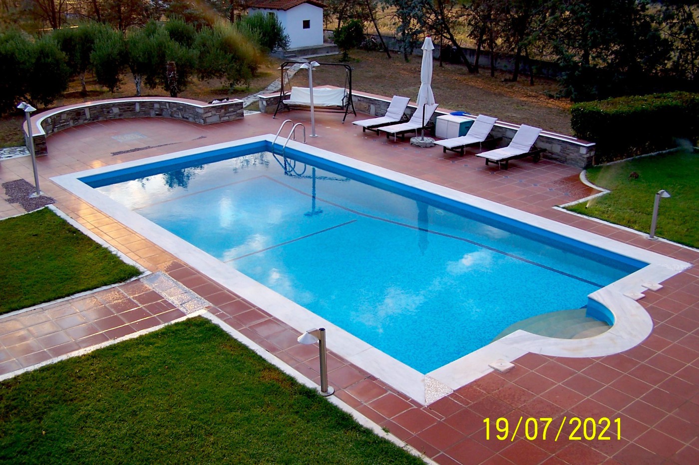 On the back side of the house there is a swimming pool 12mx6m size with the deepest point reaching 2.5 m and the shallowest 0.5m.