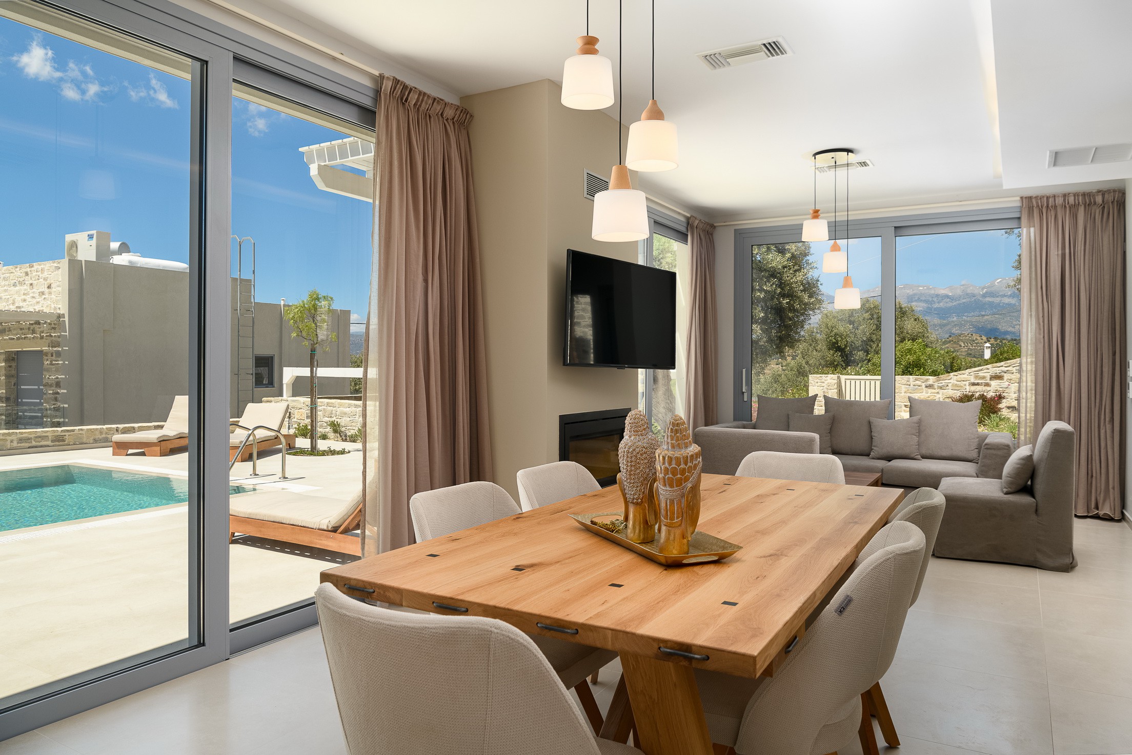 Huge open plan dining and living room space leading on to the very spacious outside area with pool.