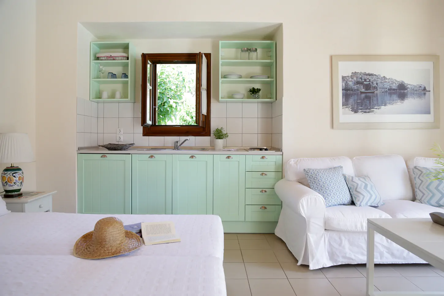 Furnished in warm colors, the self-catered apartment offers everything one needs for a comfortable stay.