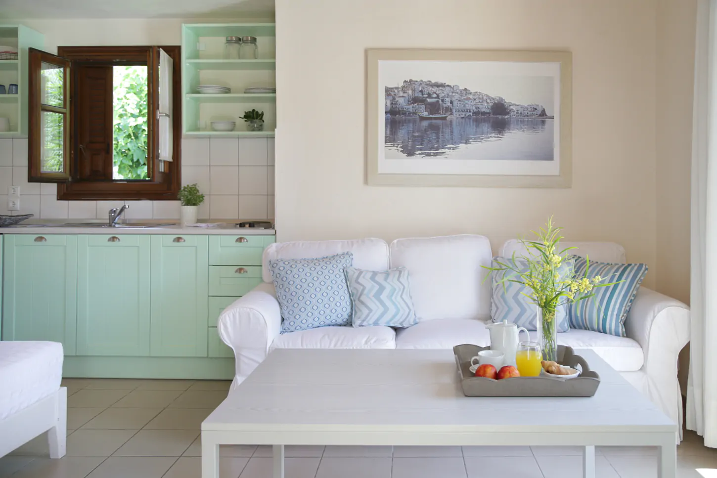 fullyequipped kitchen (including a coffee machine, kettle, toaster, juicer, teapot, and wine cooler), and