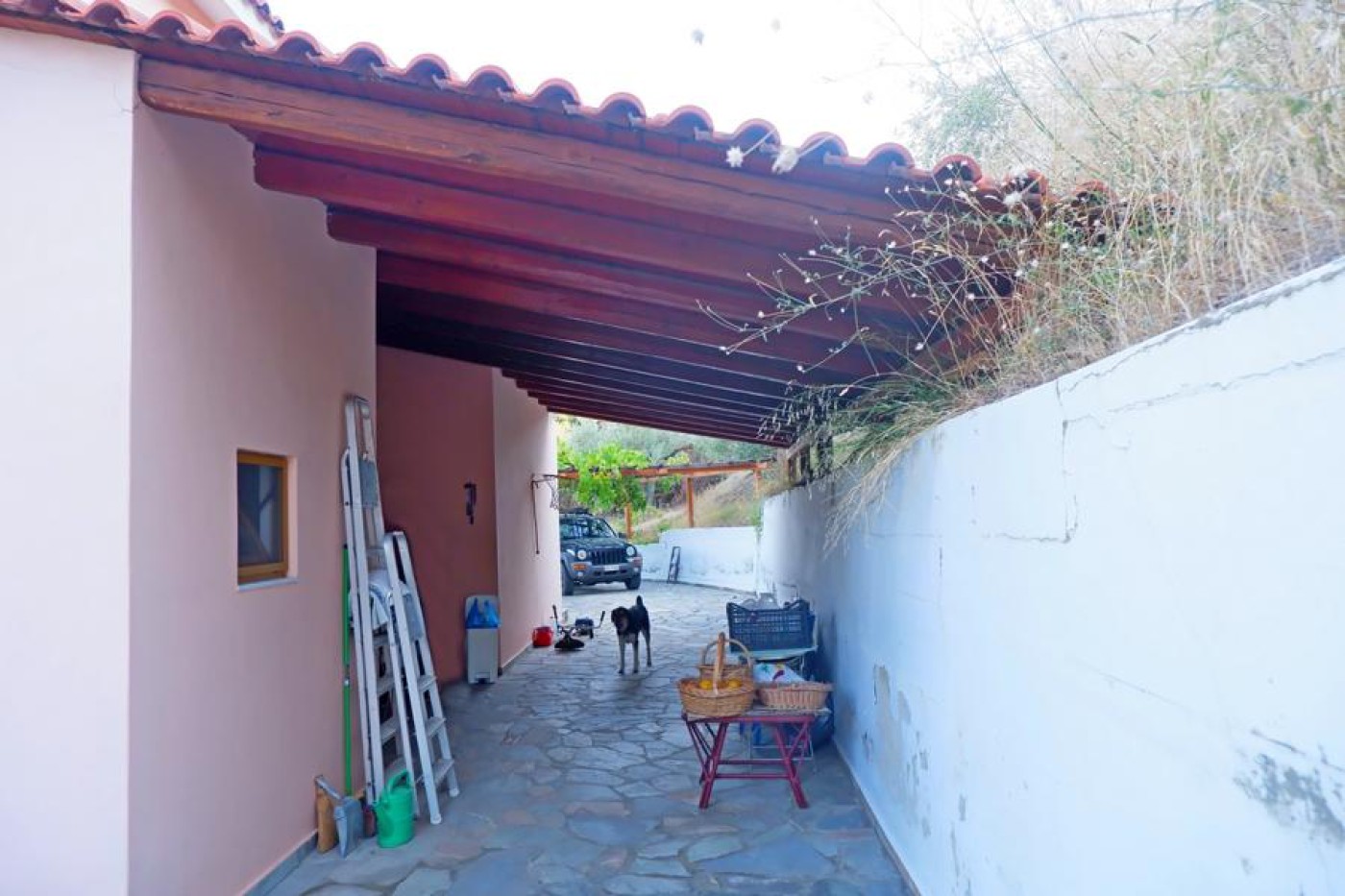 Outside: paved walkways, undercover parking leading to the kitchen door, small storage area, large