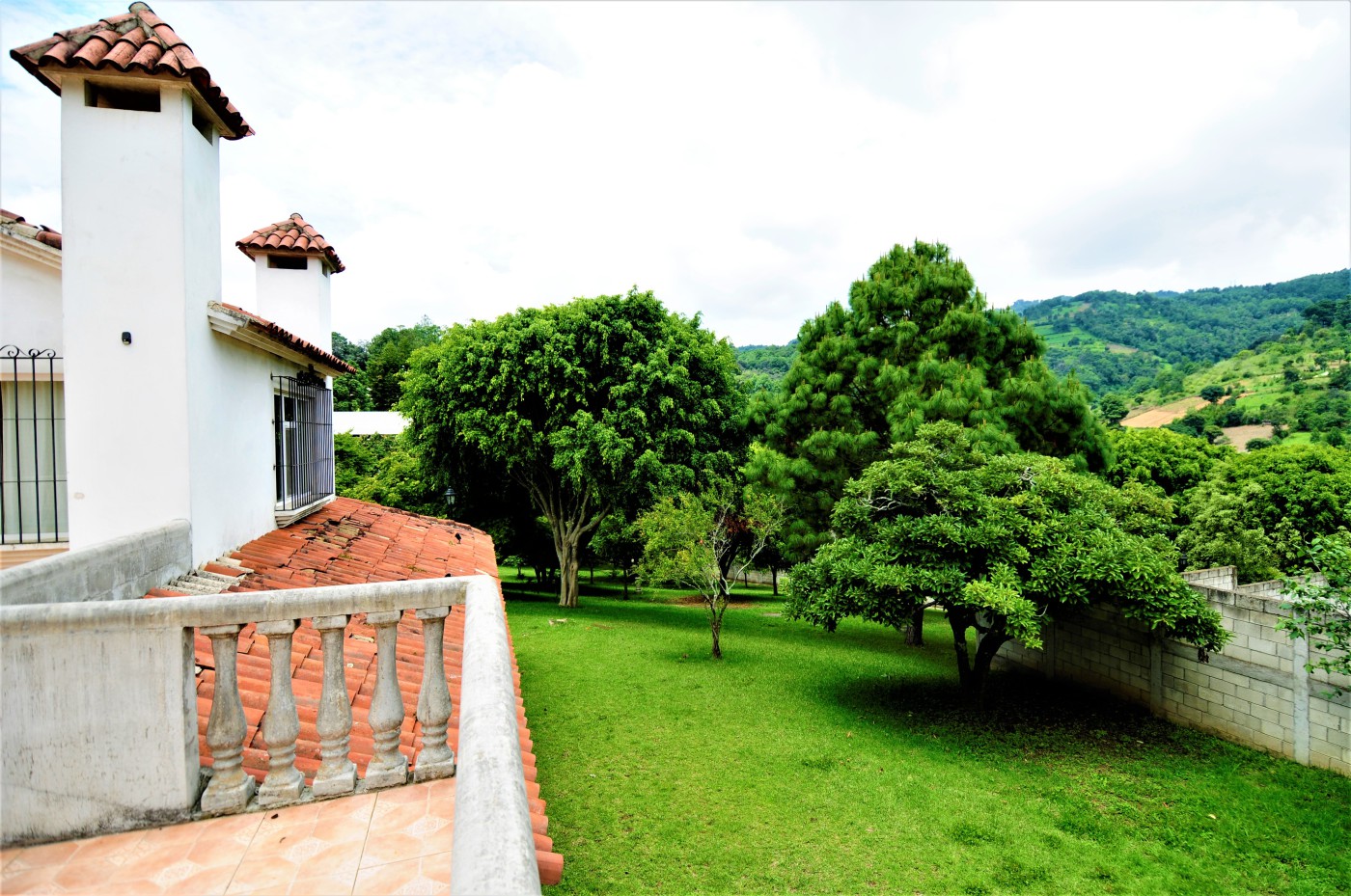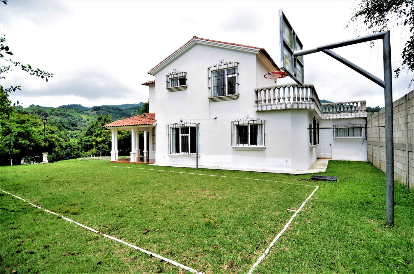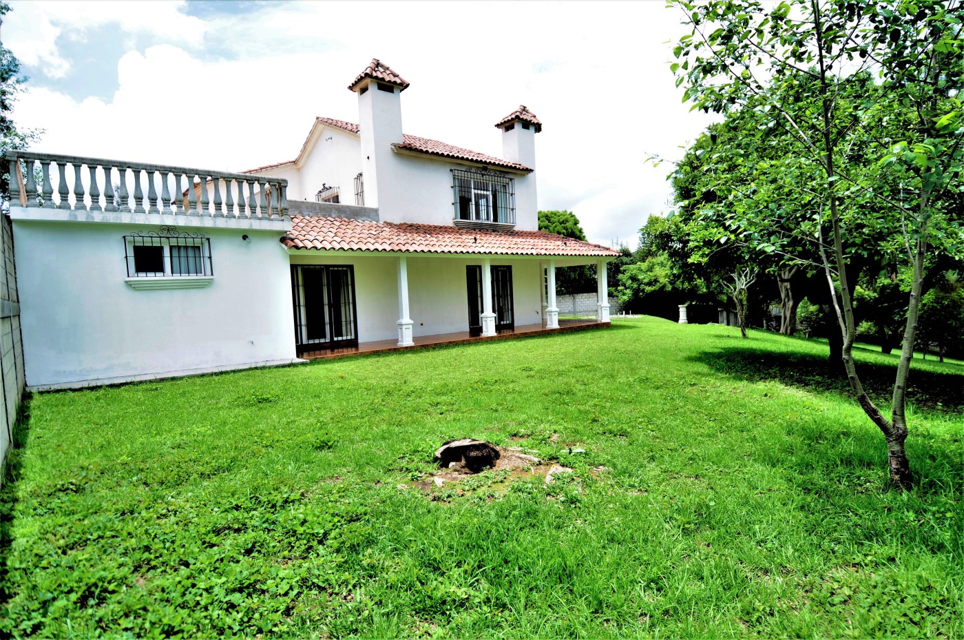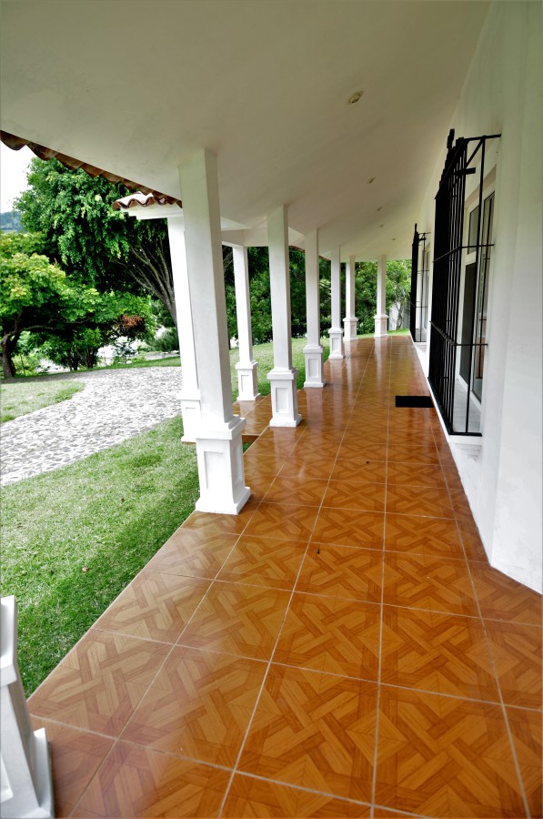 Preciosa residencia de dos niveles de estilo español que brinda una imagen de elegancia en un precioso lugar campestre con absoluta tranquilidad en venta ubicada en Santiago, Sacatepéquez, a 200 metros de la Carretera Interamericana km 34, cercanía a la Granja Lucita y es una residencia de 290 metros cuadrados de construcción con una superficie de 4216 varas cuadradas de terreno. La entrada a la propiedad es a través de un portón automático con un camino empedrado que conduce a un hermoso porche envolvente con 14 columnas donde se encuentra una bella puerta de entrada principal de madera de diseño único. La residencia está compuesta con espaciosa sala con chimenea esquinera, y gran ventanal. El comedor de concepto abierto cuenta con acceso al porche exterior y se complementa con amplia cocina abierta con multitud de gabinetes, y adyacente lavandería. La suite principal cuenta con chimenea, walk-in closet, y baño amplio con jacuzzi. También en este nivel se cuenta con cuarto de estudio o dormitorio y baño de visitas. Mediante una escalera con barandillas de madera maciza se da acceso al segundo nivel que cuenta con amplia sala familiar con acceso a una enorme terraza española con vistas panorámicas a las montañas y al valle, dos habitaciones independientes, y baño independiente. Los grandes ventanales de la residencia proveen claridad e iluminación que brindan una sensación de frescura. Finalmente, esta propiedad se complementa con gran terreno verde, arbolada y barandillas de forja de diseño en las puertas y ventanales.