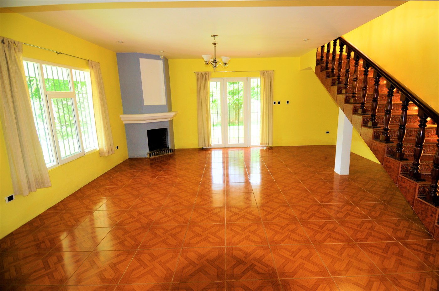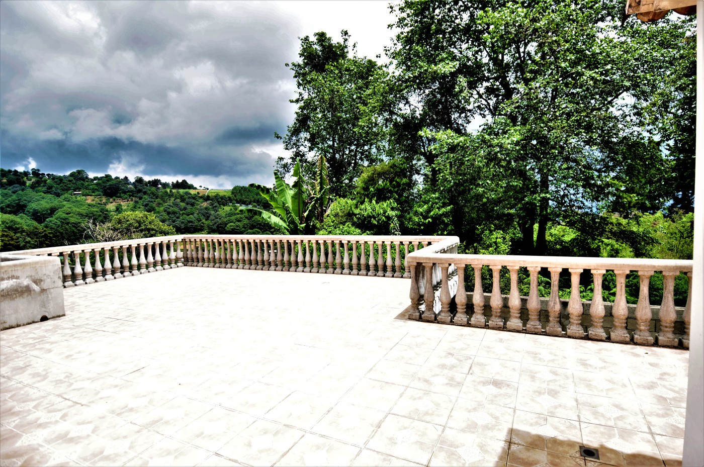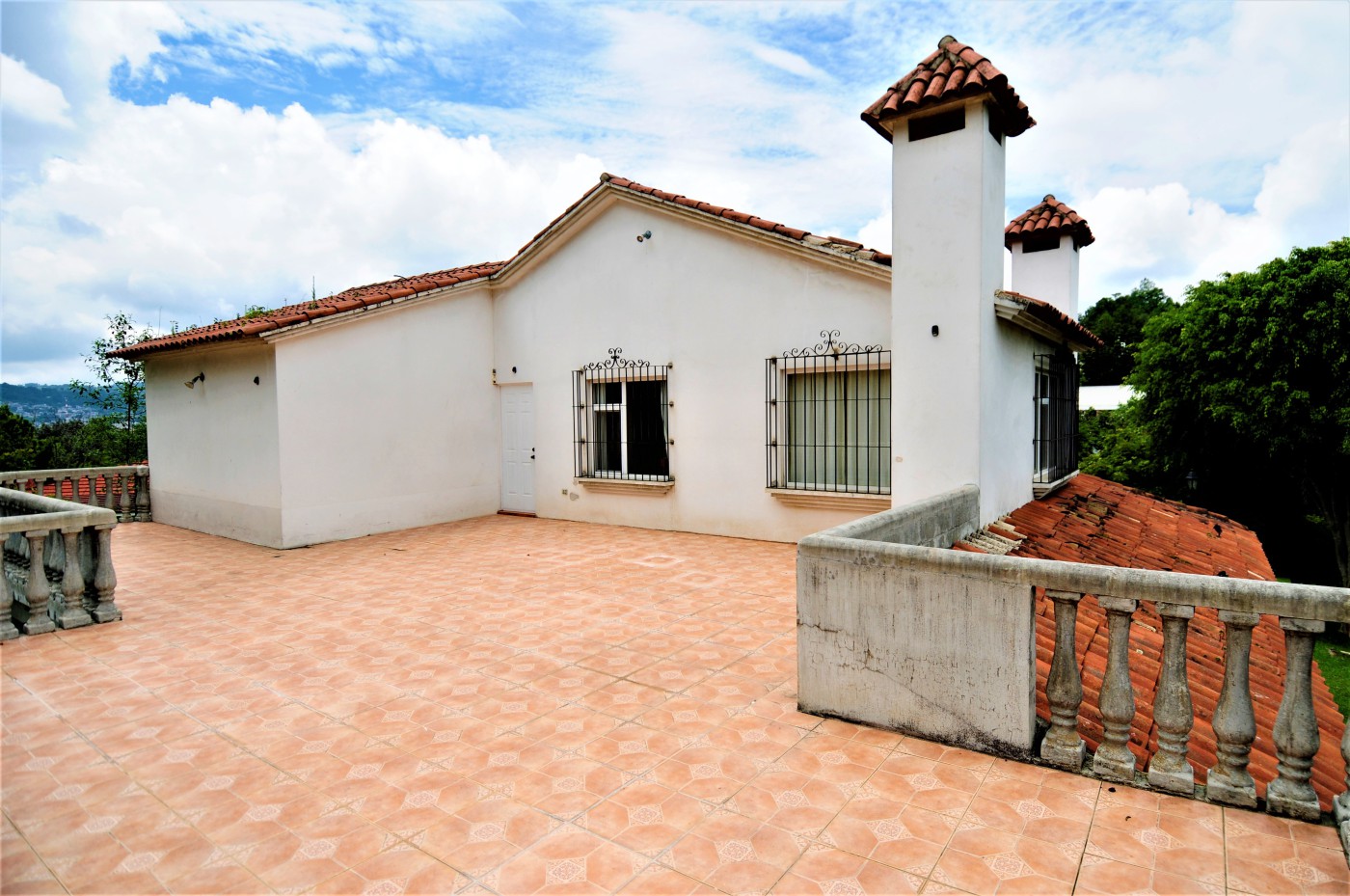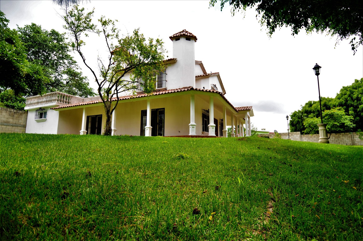 Preciosa residencia de dos niveles de estilo español que brinda una imagen de elegancia en un precioso lugar campestre con absoluta tranquilidad en venta ubicada en Santiago, Sacatepéquez, a 200 metros de la Carretera Interamericana km 34, cercanía a la Granja Lucita y es una residencia de 290 metros cuadrados de construcción con una superficie de 4216 varas cuadradas de terreno. La entrada a la propiedad es a través de un portón automático con un camino empedrado que conduce a un hermoso porche envolvente con 14 columnas donde se encuentra una bella puerta de entrada principal de madera de diseño único. La residencia está compuesta con espaciosa sala con chimenea esquinera, y gran ventanal. El comedor de concepto abierto cuenta con acceso al porche exterior y se complementa con amplia cocina abierta con multitud de gabinetes, y adyacente lavandería. La suite principal cuenta con chimenea, walk-in closet, y baño amplio con jacuzzi. También en este nivel se cuenta con cuarto de estudio o dormitorio y baño de visitas. Mediante una escalera con barandillas de madera maciza se da acceso al segundo nivel que cuenta con amplia sala familiar con acceso a una enorme terraza española con vistas panorámicas a las montañas y al valle, dos habitaciones independientes, y baño independiente. Los grandes ventanales de la residencia proveen claridad e iluminación que brindan una sensación de frescura. Finalmente, esta propiedad se complementa con gran terreno verde, arbolada y barandillas de forja de diseño en las puertas y ventanales.