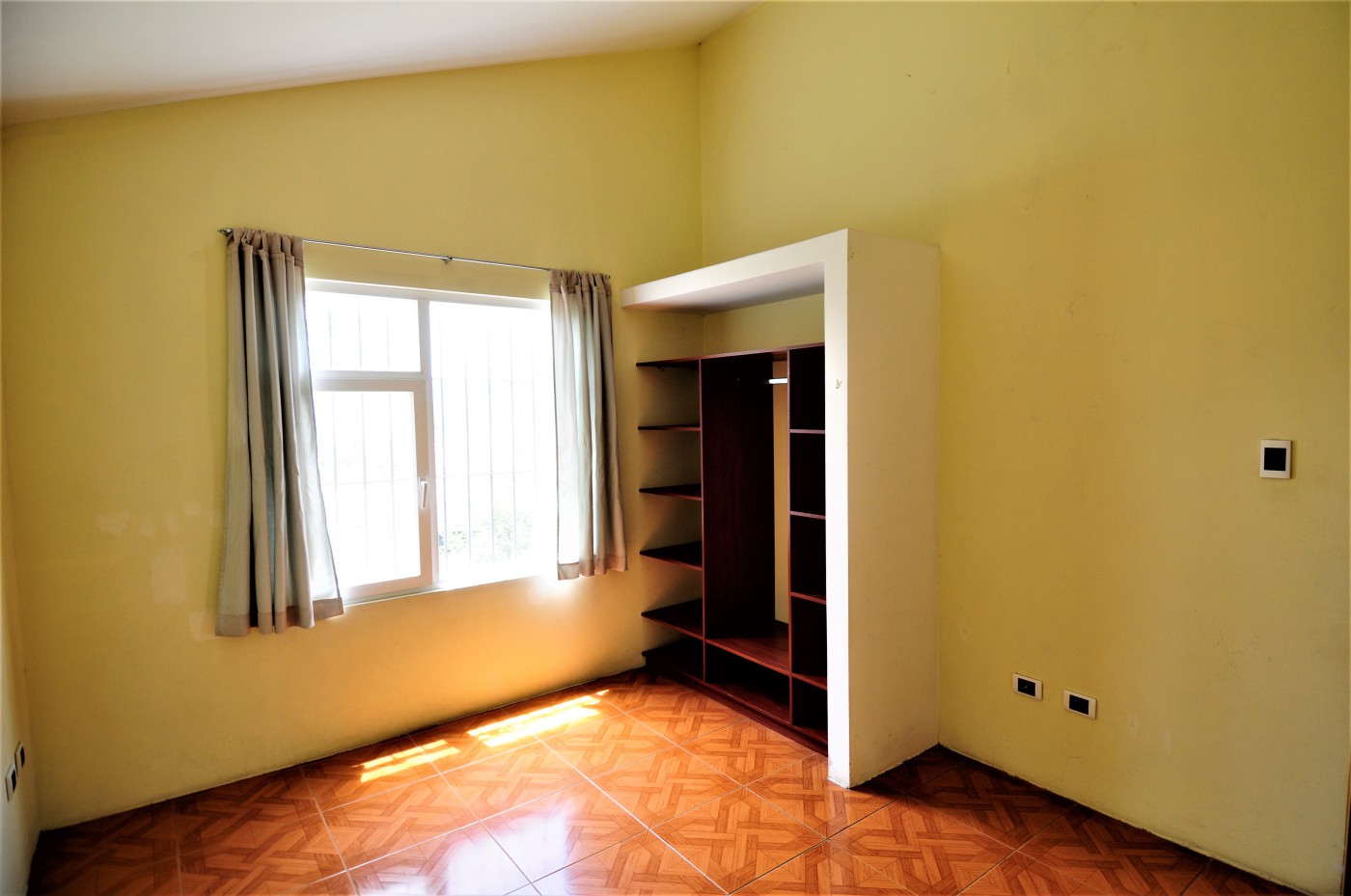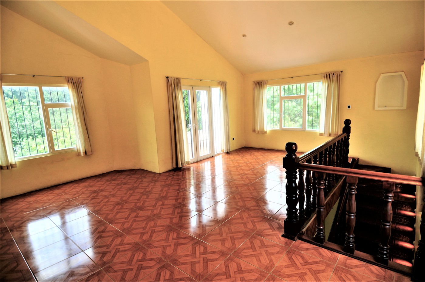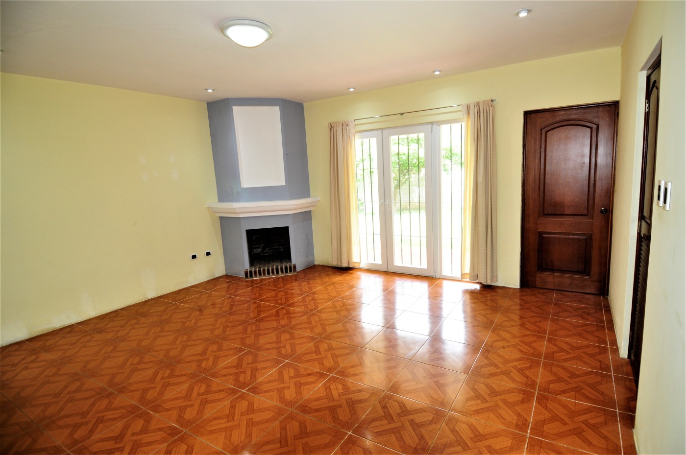 Preciosa residencia de dos niveles de estilo español que brinda una imagen de elegancia en un precioso lugar campestre con absoluta tranquilidad en venta ubicada en Santiago, Sacatepéquez, a 200 metros de la Carretera Interamericana km 34, cercanía a la Granja Lucita y es una residencia de 290 metros cuadrados de construcción con una superficie de 4216 varas cuadradas de terreno. La entrada a la propiedad es a través de un portón automático con un camino empedrado que conduce a un hermoso porche envolvente con 14 columnas donde se encuentra una bella puerta de entrada principal de madera de diseño único. La residencia está compuesta con espaciosa sala con chimenea esquinera, y gran ventanal. El comedor de concepto abierto cuenta con acceso al porche exterior y se complementa con amplia cocina abierta con multitud de gabinetes, y adyacente lavandería. La suite principal cuenta con chimenea, walk-in closet, y baño amplio con jacuzzi. También en este nivel se cuenta con cuarto de estudio o dormitorio y baño de visitas. Mediante una escalera con barandillas de madera maciza se da acceso al segundo nivel que cuenta con amplia sala familiar con acceso a una enorme terraza española con vistas panorámicas a las montañas y al valle, dos habitaciones independientes, y baño independiente. Los grandes ventanales de la residencia proveen claridad e iluminación que brindan una sensación de frescura. Finalmente, esta propiedad se complementa con gran terreno verde, arbolada y barandillas de forja de diseño en las puertas y ventanales.