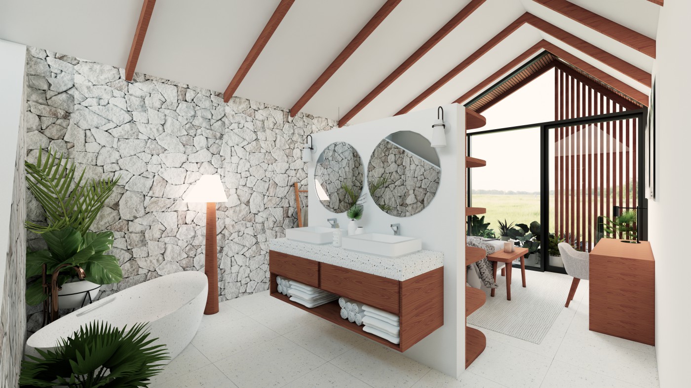 Each villa (≈ 78 m²) offers 1 bedroom and 1 bathroom, with white interiors
