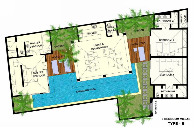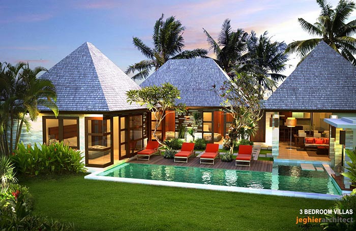 Arama Riverside Villas has secured a 36 Are (3.600 square metres) plot of leasehold land for forty years in Seminyak, the up market heart of Bali. We have finished building six three bedroom villas and five two bedroom villas all with private pools, parking, reception area and full 24/7 security.