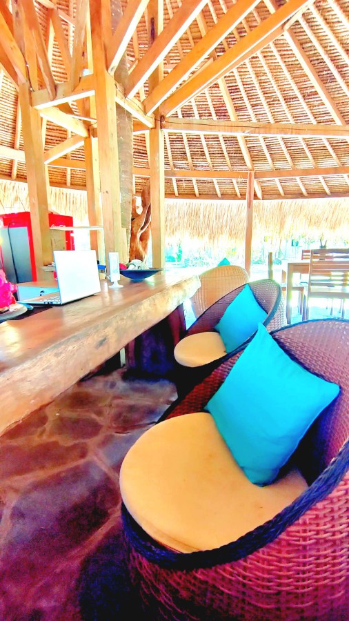 Alang Alang roof overlooking a garden and its infinity pool, restaurant and Spa.