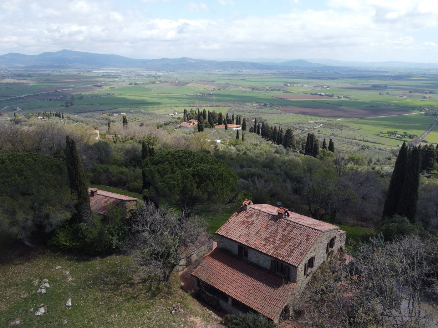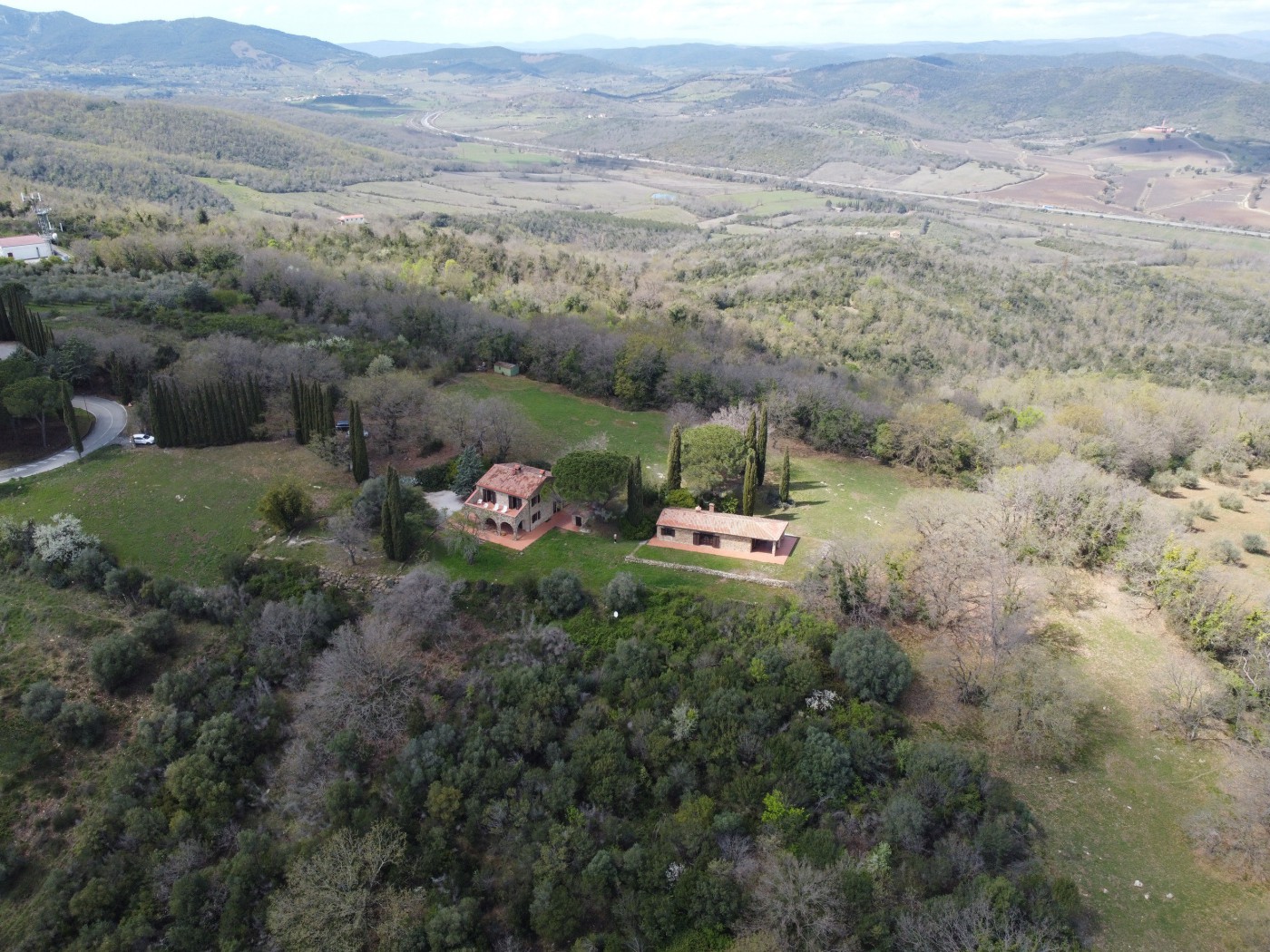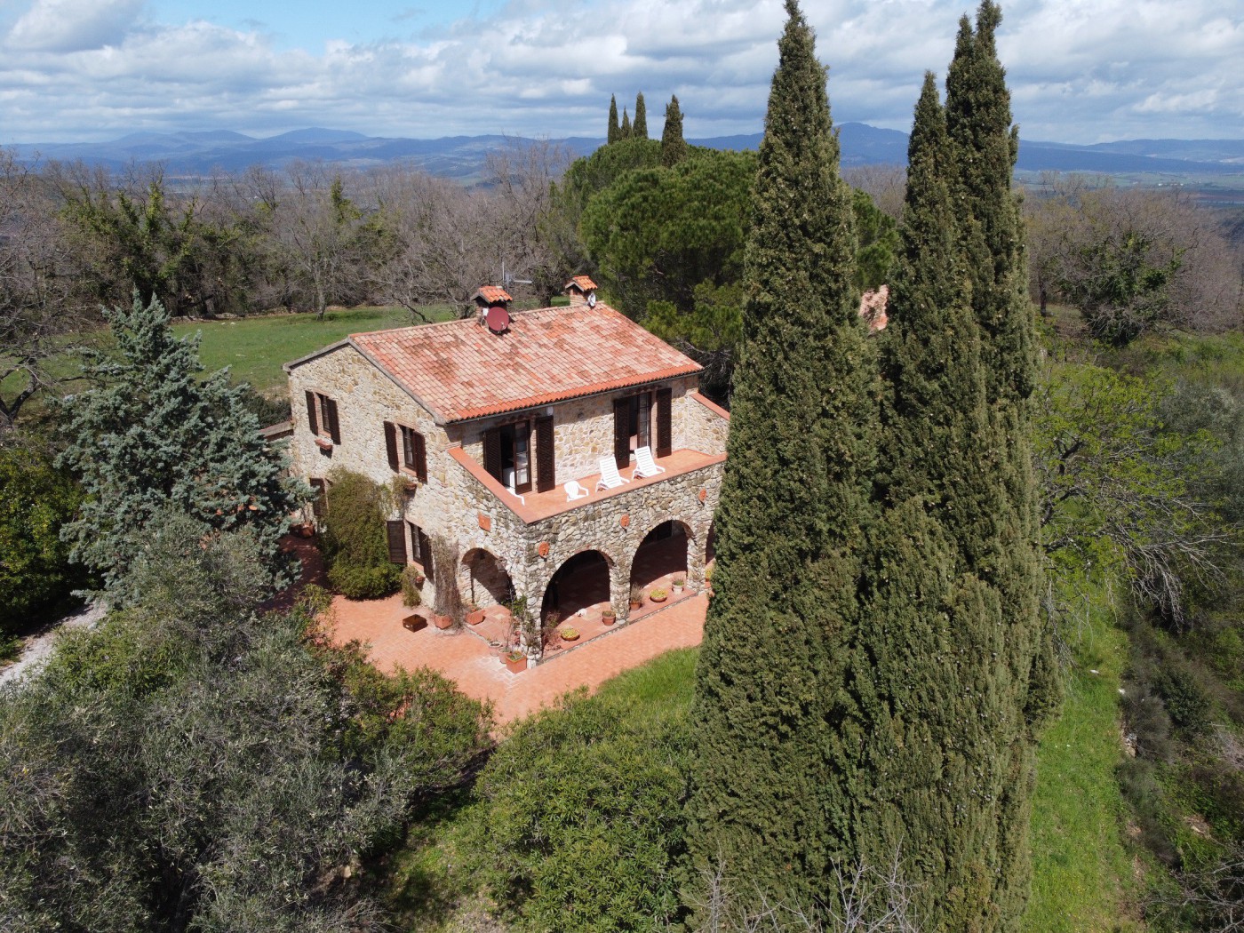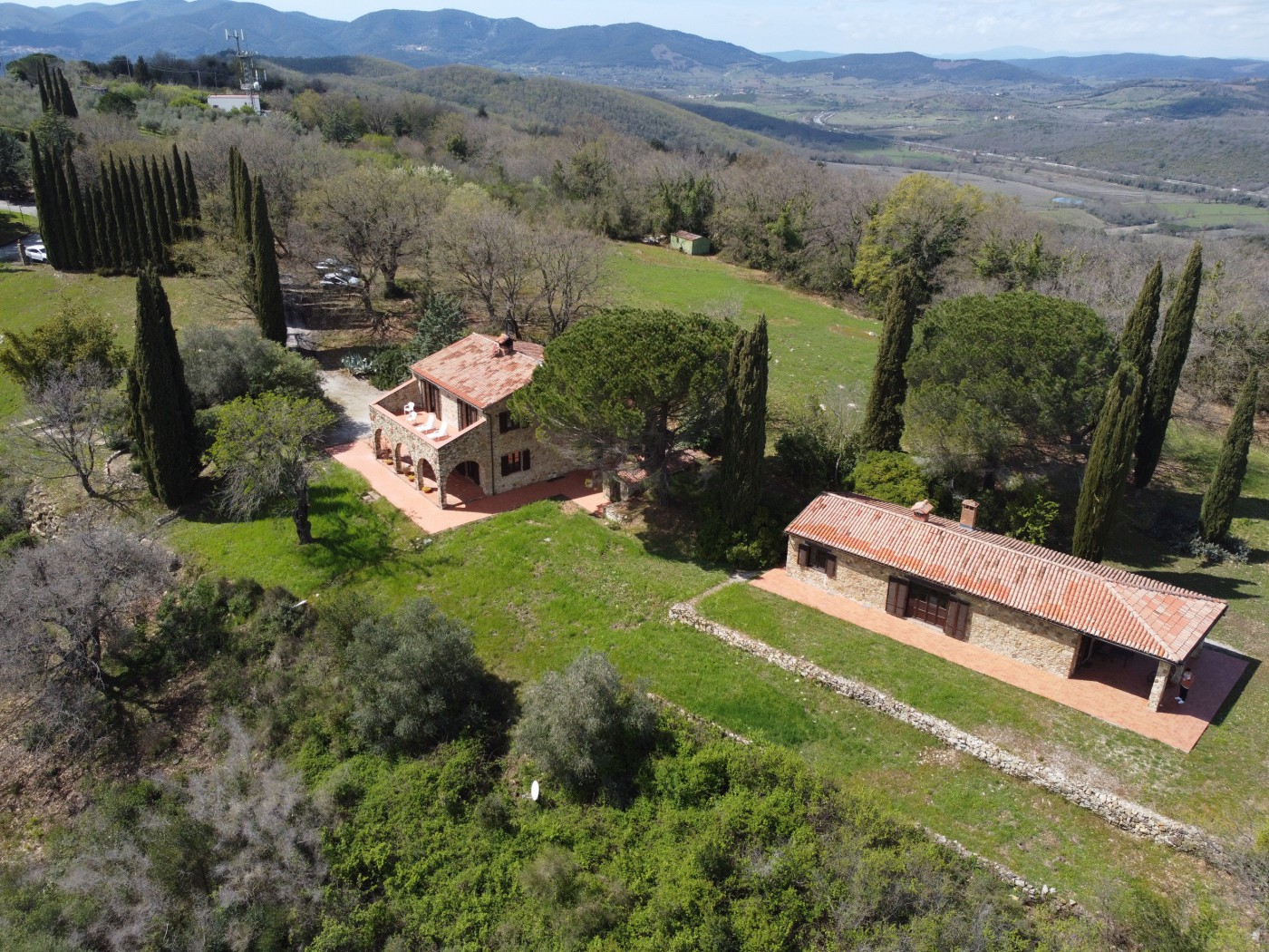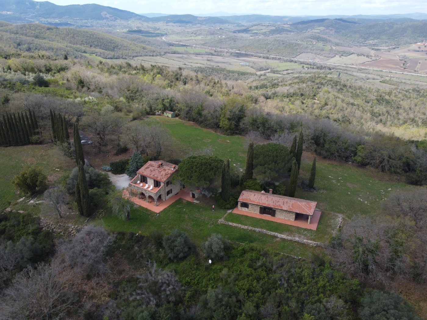 Giuncarico Stone villa with outbuilding and unique view REDUCED BY 10% - Giuncarico, for exclusive sale a Splendid villa built with exposed stones of the place rough-hewn by hand, for a total of about and one outbuilding, also built with the same stone as . The main building is composed as follows, large entrance porch of approx, double living room with fireplace and large masonry stove covered with refractory majolica (Kachelogen type) with hot air also being sent to the upper floor by means of special ducting, eat-in kitchen and a large room with windows, currently used as an art studio. On the first floor, connected by a comfortable internal staircase, there are 3 bedrooms, a large walk-in closet wardrobe, a bathroom (possibility of making another one), a closet and a beautiful terrace of about from which you can enjoy a splendid panorama that goes from the Grosseto plain to the Park of the Maremma and the Argentario promontory. On the second floor, connected by a trapdoor and retractable staircase, We find an attic of about usable exclusively for storage use. All floors of This property, are covered with hand-painted artistic ceramics from Vietri. Particular attention is paid to thermal insulation work, carried out on the perimeter walls through the construction of a double wall with insulating panels and cavity filled with expanded clay. Thanks to this system, And thanks to the airtight windows, the building retains a temperature of up to 10 degrees inside in summer lower on the outside; while on the other hand, heating can be easily carried out, so that the all eco-compatible, with the help of the refractory majolica stove only. The second villa is located a short walk from twenty meters from the aforementioned main building. It is a characteristic cottage entirely made of stone open room, both inside and outside. The interior is made particularly warm and welcoming by the typical gabled roof with support beams and ceiling covered with expanded cork panels and Wood paneling. The building is entirely on the ground floor with an extension of about 90 square meters, In addition to 30 square meters of covered outdoor porch and divided as follows: large living room in a central position with large exposed stone fireplace, two bedrooms, kitchen, dressing room and bathroom. Heating is secured by a typical, large traditional Danish stove made of decorated cast iron. From the kitchen you can reach the porch built along the east side of the building. The land surrounding the villas is approximately, consisting of a large garden all around the buildings and an arboreal heritage that accompanies the land, partly spontaneous, partly due to the owner s intervention, over many decades. Are there are over a hundred majestic oaks, some of which are centuries-old, about forty cypresses, olive trees, pines and a centuries-old almond tree.