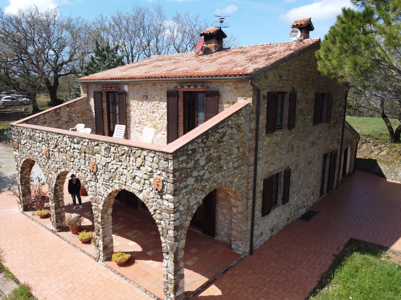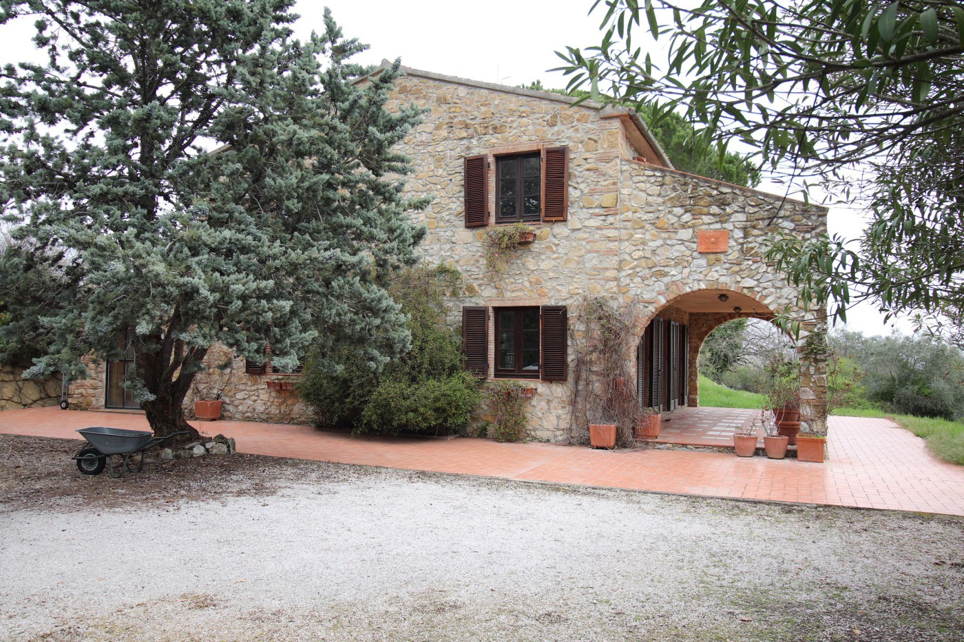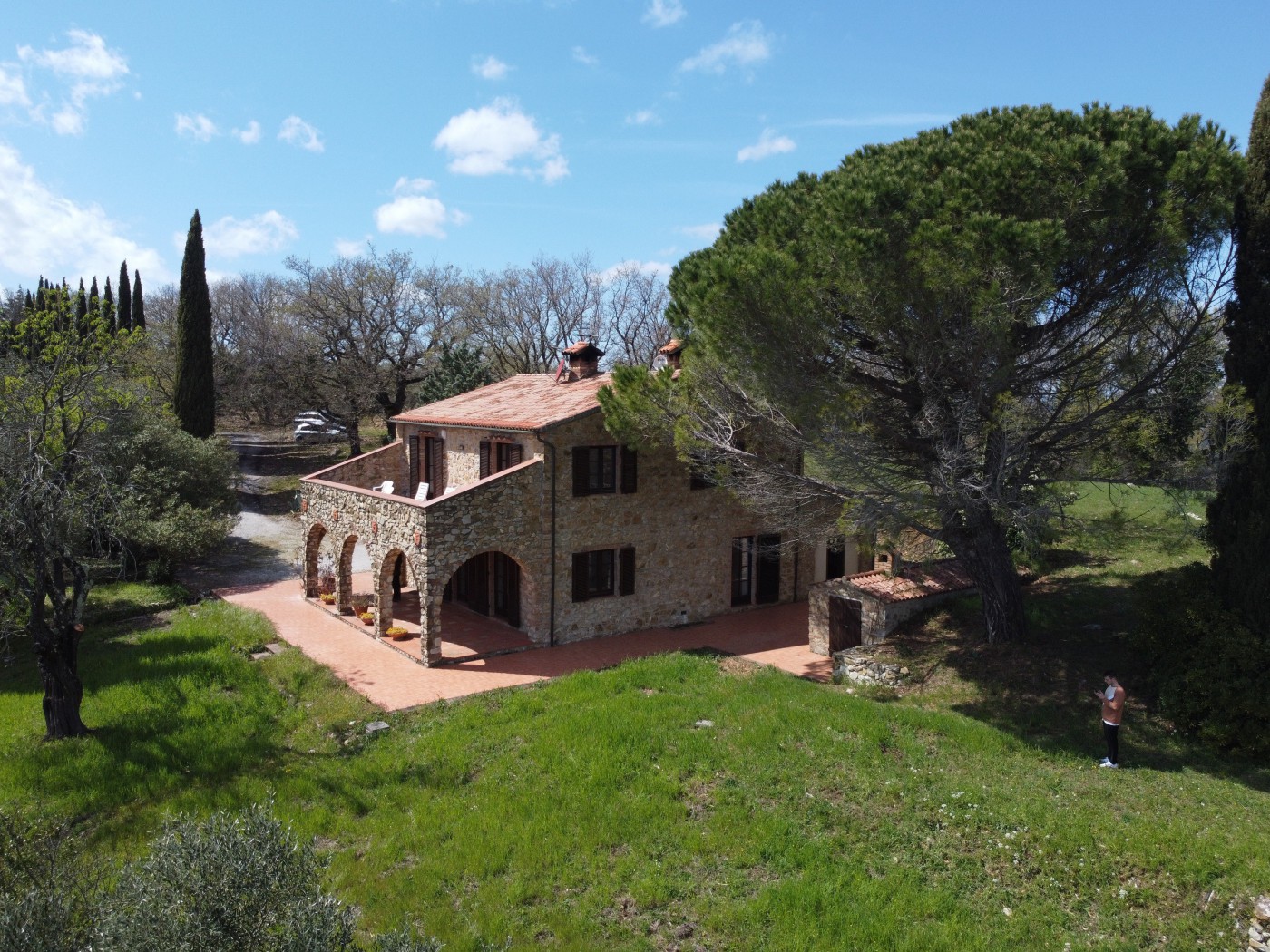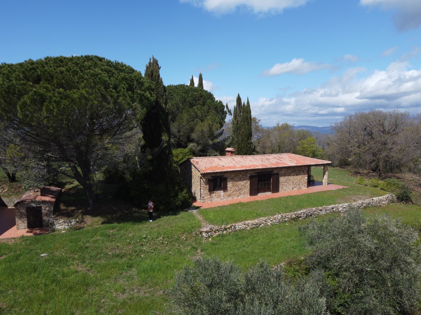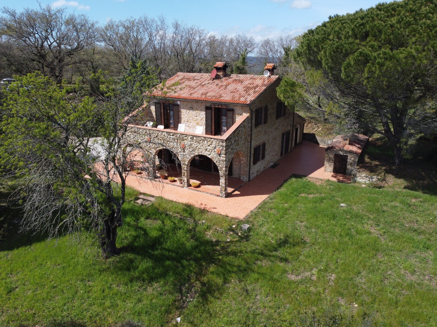 Giuncarico Stone villa with outbuilding and unique view REDUCED BY 10% - Giuncarico, for exclusive sale a Splendid villa built with exposed stones of the place rough-hewn by hand, for a total of about and one outbuilding, also built with the same stone as . The main building is composed as follows, large entrance porch of approx, double living room with fireplace and large masonry stove covered with refractory majolica (Kachelogen type) with hot air also being sent to the upper floor by means of special ducting, eat-in kitchen and a large room with windows, currently used as an art studio. On the first floor, connected by a comfortable internal staircase, there are 3 bedrooms, a large walk-in closet wardrobe, a bathroom (possibility of making another one), a closet and a beautiful terrace of about from which you can enjoy a splendid panorama that goes from the Grosseto plain to the Park of the Maremma and the Argentario promontory. On the second floor, connected by a trapdoor and retractable staircase, We find an attic of about usable exclusively for storage use. All floors of This property, are covered with hand-painted artistic ceramics from Vietri. Particular attention is paid to thermal insulation work, carried out on the perimeter walls through the construction of a double wall with insulating panels and cavity filled with expanded clay. Thanks to this system, And thanks to the airtight windows, the building retains a temperature of up to 10 degrees inside in summer lower on the outside; while on the other hand, heating can be easily carried out, so that the all eco-compatible, with the help of the refractory majolica stove only. The second villa is located a short walk from twenty meters from the aforementioned main building. It is a characteristic cottage entirely made of stone open room, both inside and outside. The interior is made particularly warm and welcoming by the typical gabled roof with support beams and ceiling covered with expanded cork panels and Wood paneling. The building is entirely on the ground floor with an extension of about 90 square meters, In addition to 30 square meters of covered outdoor porch and divided as follows: large living room in a central position with large exposed stone fireplace, two bedrooms, kitchen, dressing room and bathroom. Heating is secured by a typical, large traditional Danish stove made of decorated cast iron. From the kitchen you can reach the porch built along the east side of the building. The land surrounding the villas is approximately, consisting of a large garden all around the buildings and an arboreal heritage that accompanies the land, partly spontaneous, partly due to the owner s intervention, over many decades. Are there are over a hundred majestic oaks, some of which are centuries-old, about forty cypresses, olive trees, pines and a centuries-old almond tree.