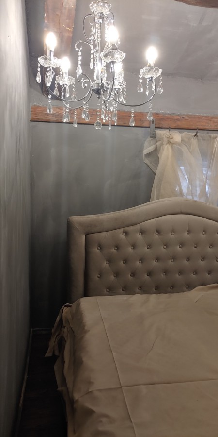 - Bedroom with new larch wood flooring, Murano glass chandeliers, and spacious ceilings (up to 3.5 m high)