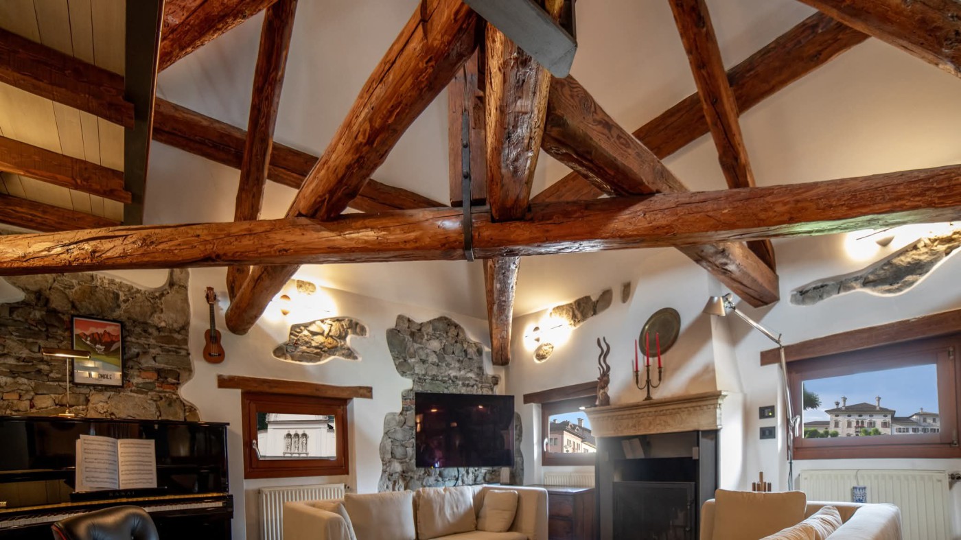 • Spacious living area with exposed beams, fireplace, and original stone wall