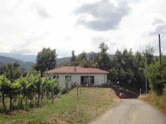 (VIL0045) Detached house with surrounding land, in a sunny, panoramic and 1 km. each service position: ground floor lounge with kitchenette, balcony and direct access to the terrace of approx. 40, landing, two double bedrooms and bathroom with tub and shower downstairs (garden height) consists of a large basement with kitchen, basement and bathroom (to be completed). Heating (LPG) and wood-burning cast iron stove in the living area. Total Area: square meters. 180. Two garages, one is double, the second is single with automatic garage door. Surrounding land: sqm. 1200.