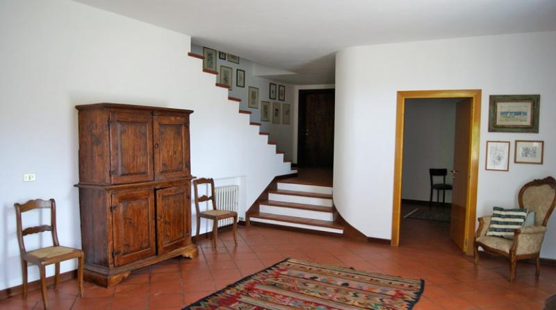 The house welcomes you in a huge living room all in Tuscan style with arch dividing the areas. A