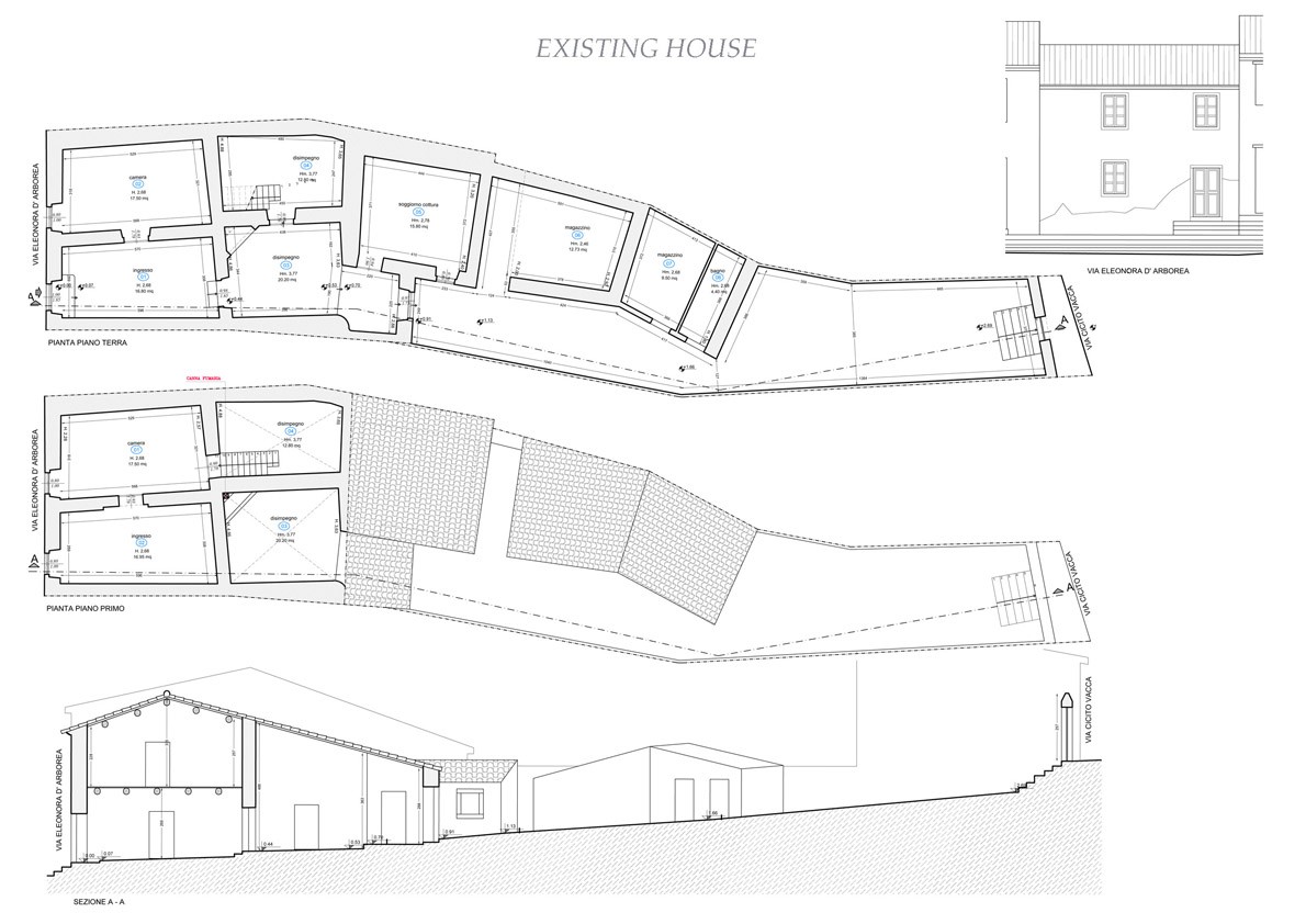 The secondary part of the property consists of two rooms and a bathroom, the result of subsequent additions, with direct access from the courtyard. According to the project developed, almost all of this second part of the house will be demolished to free space for a courtyard / garden and a parking space with access from the back street. This refurbishment will bring back to ancient patterns of the campidanese house where the property will have an area of about 120 square meters while the courtyard and the parking space will develop for the remaining 100 square meters.