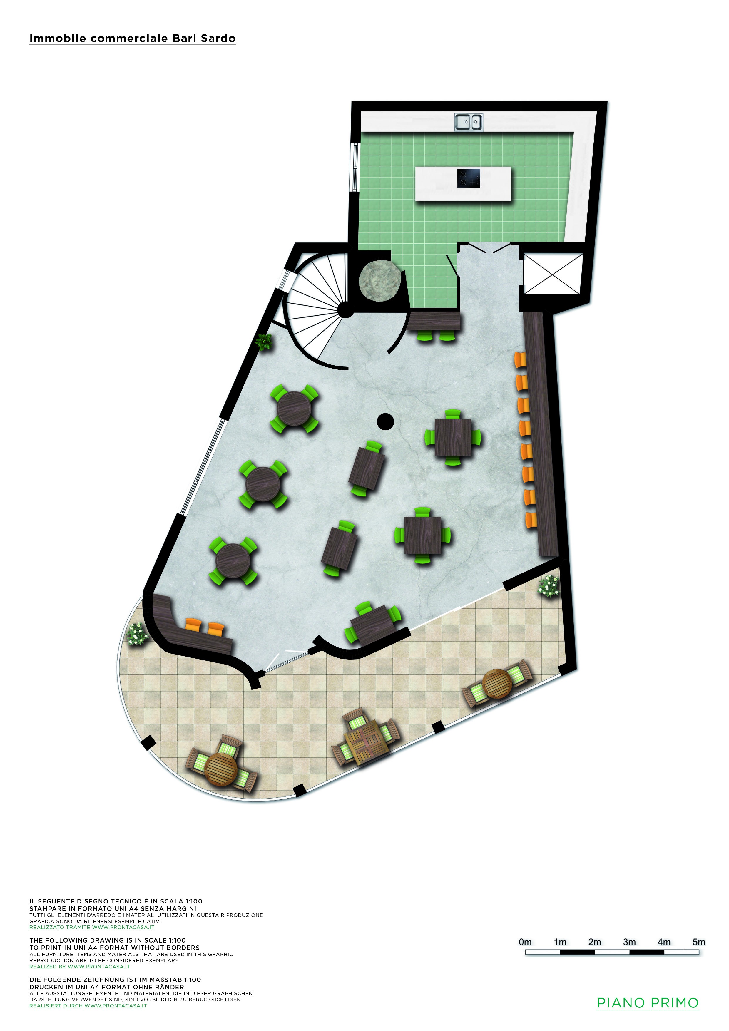The ground floor is used as a bar, and it has a covered veranda. There are three bathrooms for the customers, one of which is for people with disabilities.
