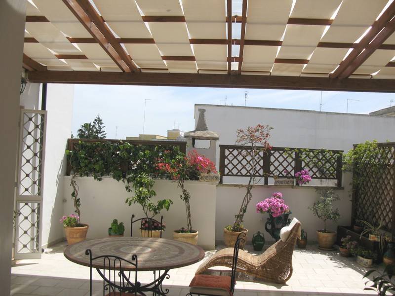 air courtyard (Salento style) and climbing stairs. On the court and on the stairs there is a