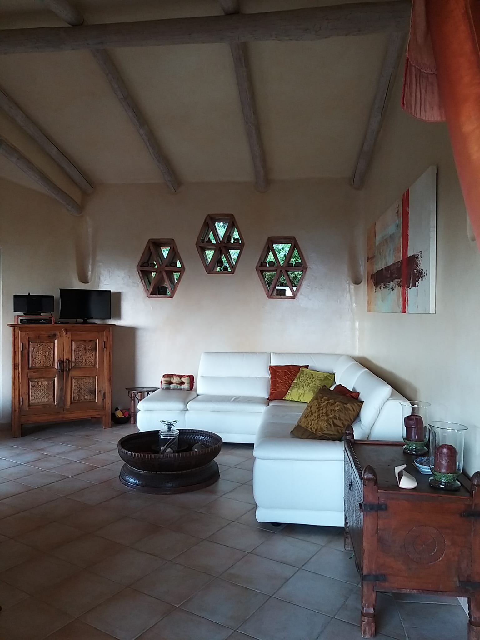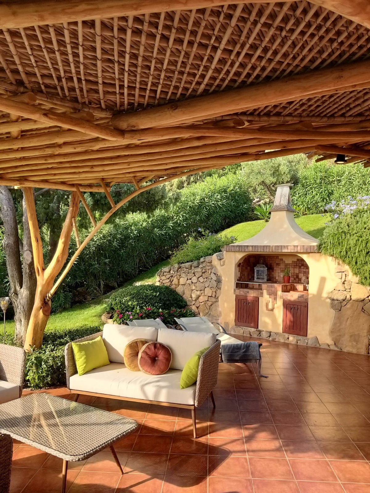 terrace is beautifully linked to the interiors: it is partly roofed by an interweaving reed