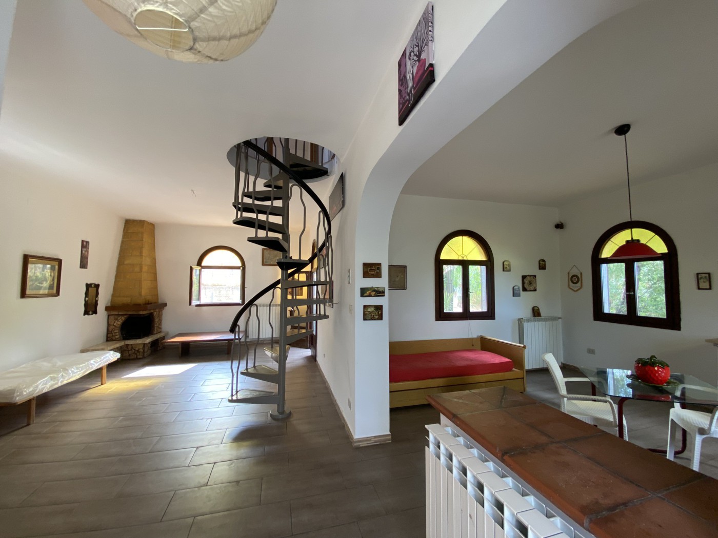 The main entrance reveals a large open space plan of 100sqm. Delicate stained glass