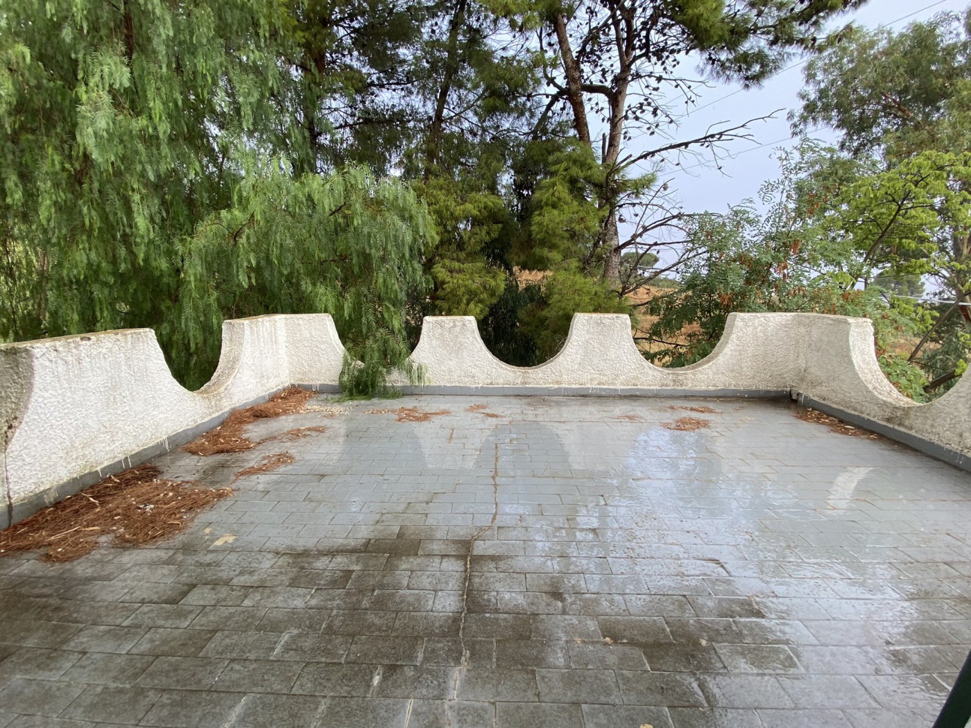 The gate entrance reveals a beautiful stone tiled garden, among grand trees, nature, and