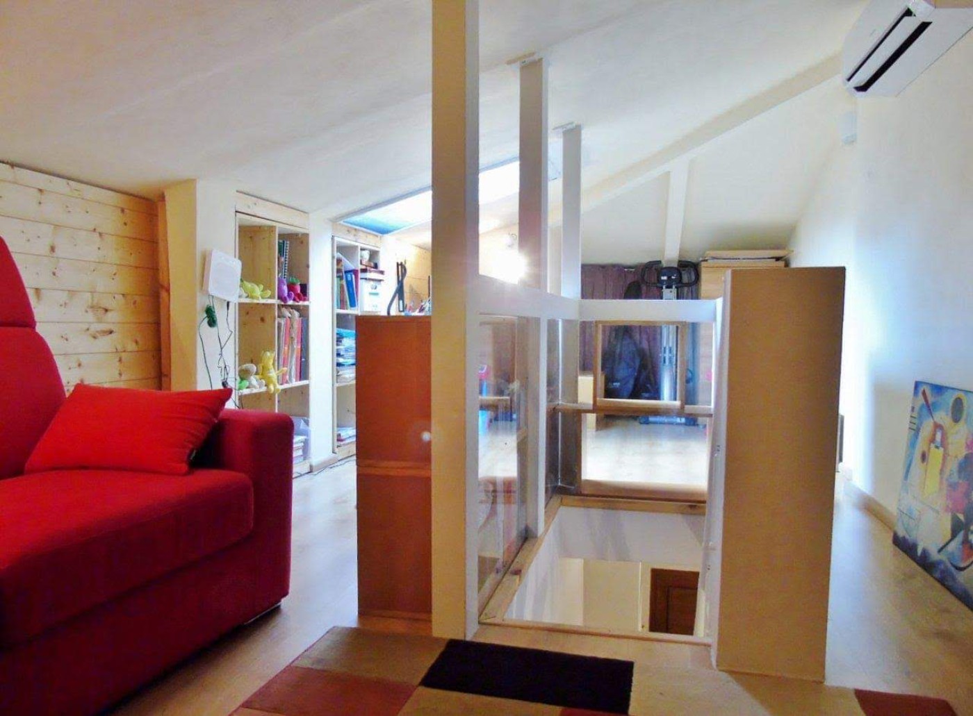 Passing by the entrance, from where stairs are visible, a rung leading to the attic used as a study area and refurbished with plant electric and inverter, it is accessed to the 9m2 bedroom (arranged with a square plan) and then to the large double room (about 18m2). Finally, the property is completed with a bathroom with a marble sink and a shower of 100x70. The fixtures are in aluminum and double glazing. There are no condominium expenses.