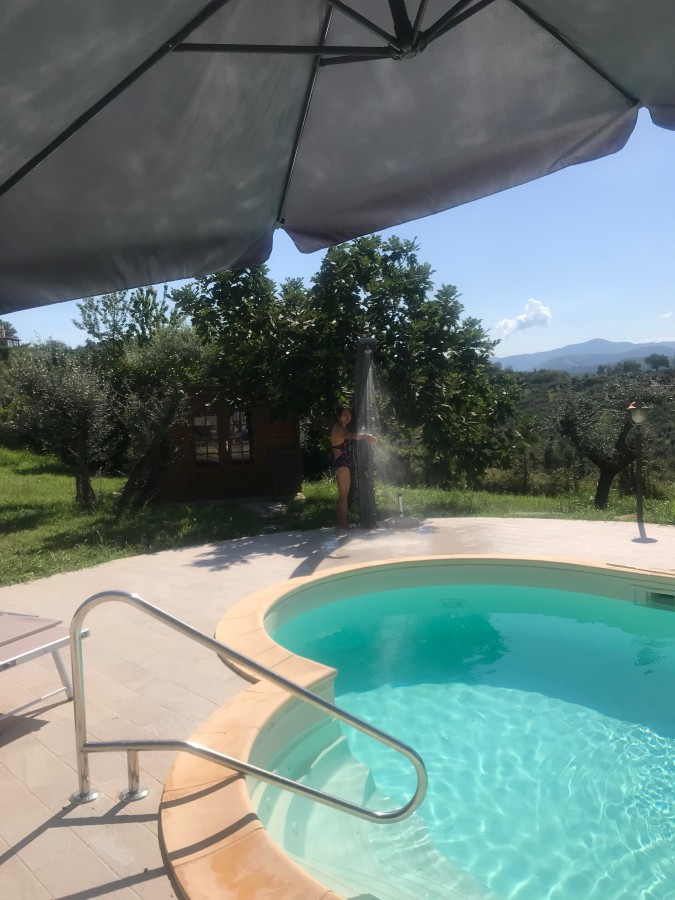 There is a nice living room and a small but functional kitchen. The large outdoor space make this house ideal for families with children It’s a real pleasant oasis surrounded by greenery, ted with roses in bloom all year round. At the center of a lush olive grove you will find a swimming pool, artfully lit at night