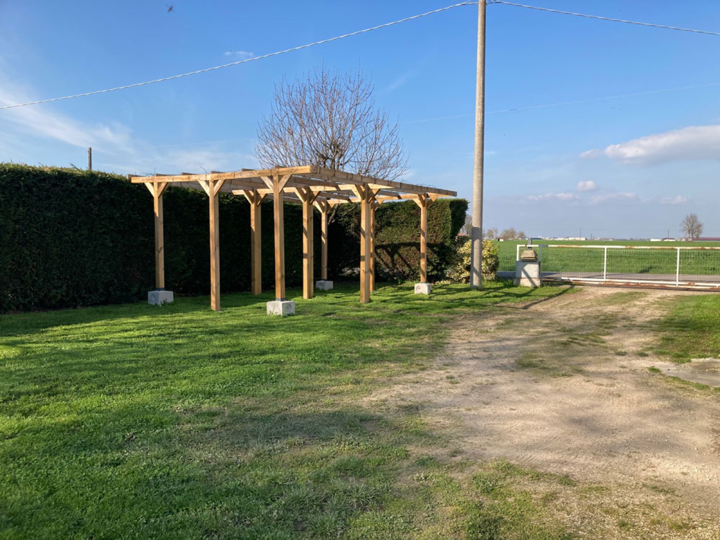 The large garden, spanning 1700 square meters, is fenced and bordered by a beautiful hedge on three sides, overlooking the charming countryside of Mirandola (Modena). In September 2023, a well was dug, and the space allows for the installation of a swimming pool or other recreational facilities. A wooden tool shed was built during the same period. The garden is adorned with various trees, including pomegranates, figs, pears, and elms. There are two gates, one of which is prepared for automation.