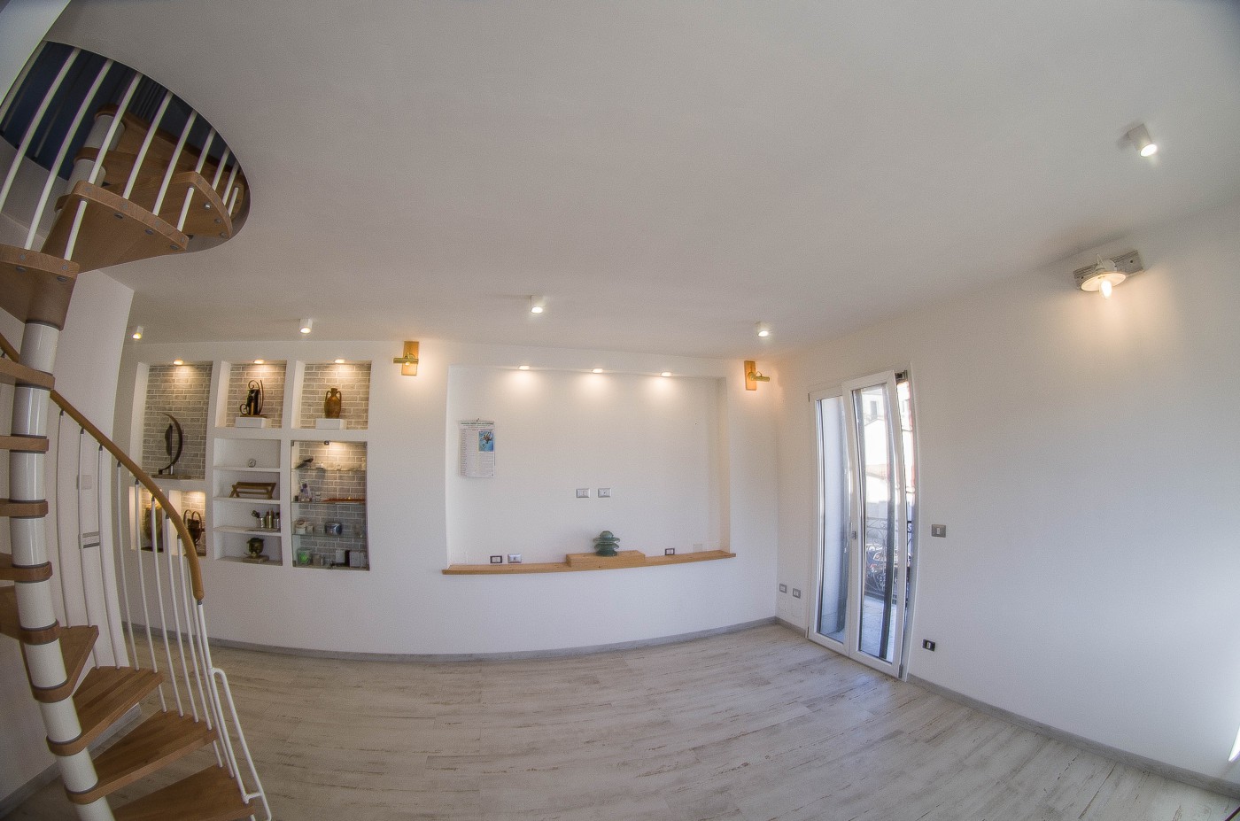 From the living room via a `Fontanot` spiral staircase, with very thick solid beech steps and with additional steps for a more comfortable climb, you access the upper compartment with a window and a French door for access to the terrace and to a breathtaking view. The large 20m2 terrace illuminates the living area with natural light. The spacious terrace with built-in kitchen top and sink with hot and cold water becomes the environment that can be used optimally in the summer also for outdoor meals and aperitifs enjoying unforgettable views, ideal for romantic evenings or for socializing with friends who enjoy the terrace with sandblasted brick pillars with recessed LED lights and a prestigious ancient nailed iron railing from the early 1900s. All internal spaces are designed for retractable sliding doors with counterframe in the masonry.
