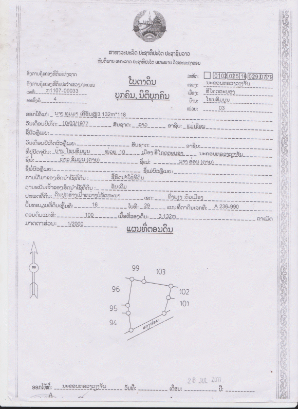Property located in Phomsomboon Village near Airport, new roads being installed in this area. 3132m2.