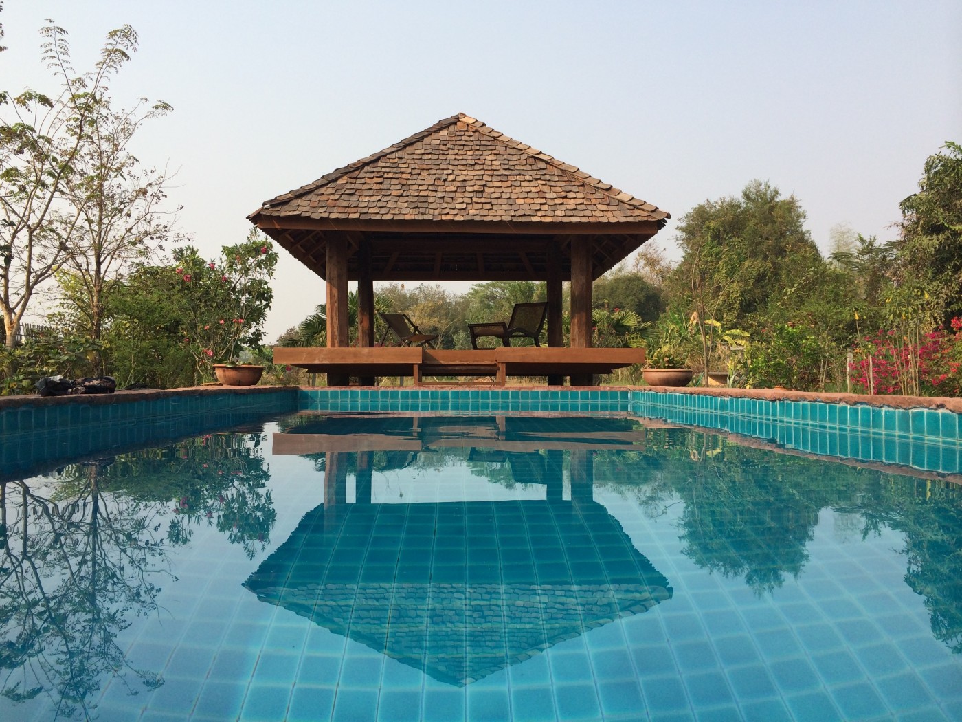 Unique beautiful wooden house, in Thai/Bali style, nested in 5400m2 garden (trees and flowers), with swimming pool and garage. 4 bedrooms/huge living room/kitchen on 372m2 floor. Furnished and decorated by French designers. Ground floor with sofas, armchairs, hamoc. Featured in many Lao and Thai style magazines.