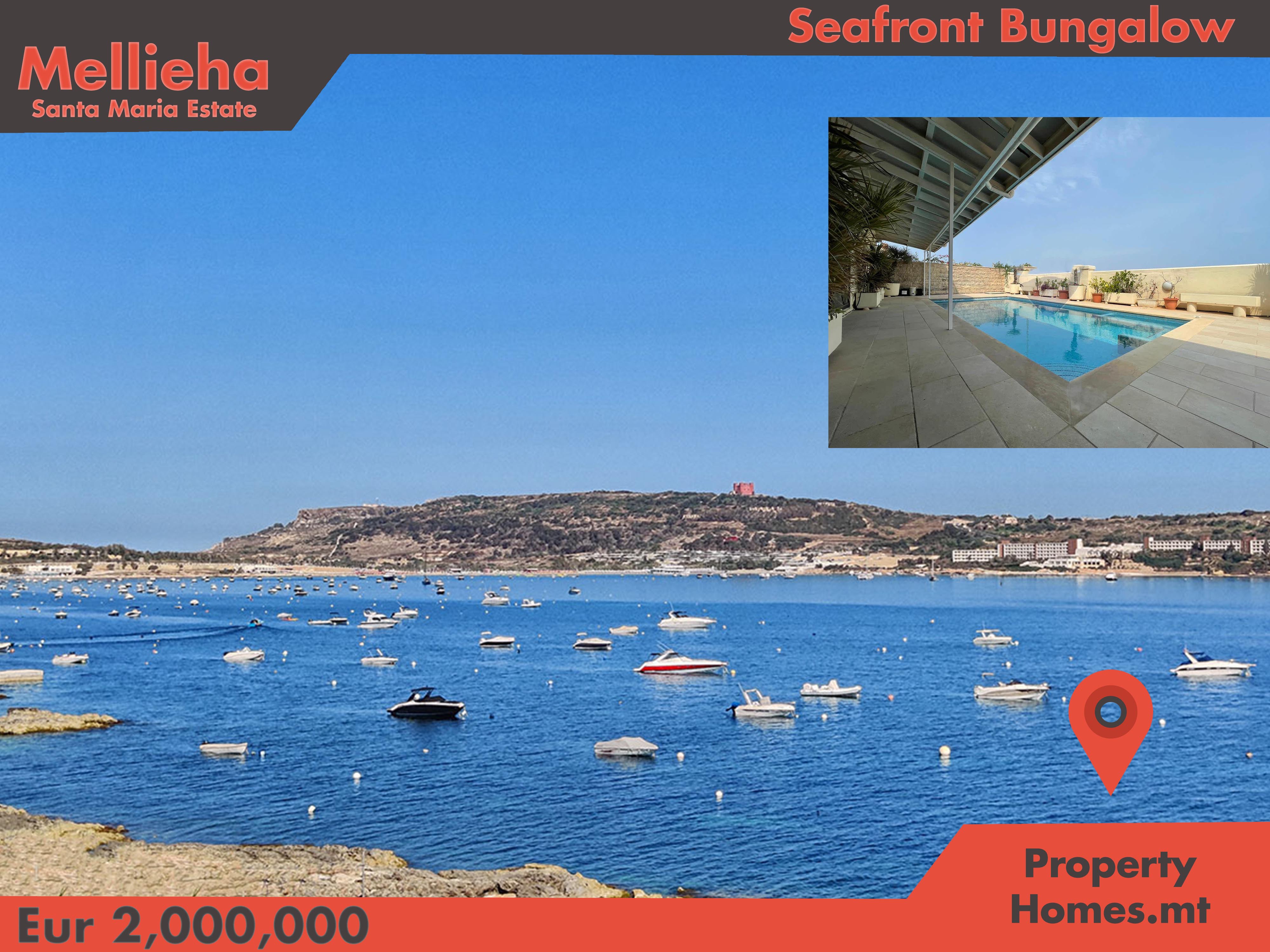 Santa Maria Estate (MELLIEHA) �` A SEA-FRONT good sized older style three bedroom Bungalow set on a plot of circa 1000m² with a back garden and a good sized pool. The property offers the new owners great potential due to it`s size and fantastic location. One car lock up garage with one car drive comes with the property.