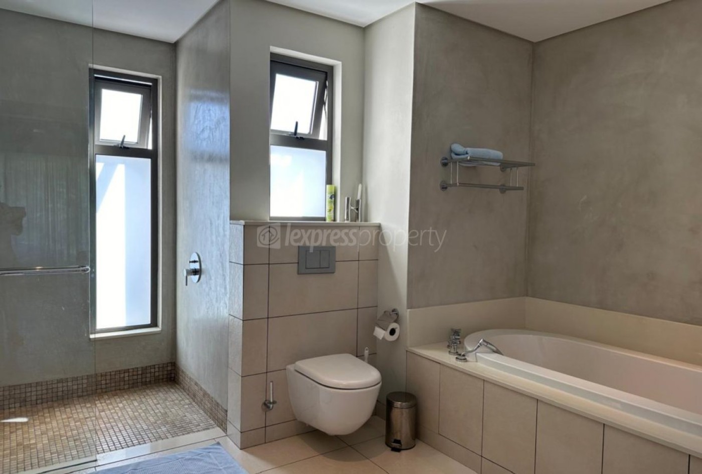 with a tub and shower. The villa also boasts a private garden of 380.6m², a 30m² swimming
